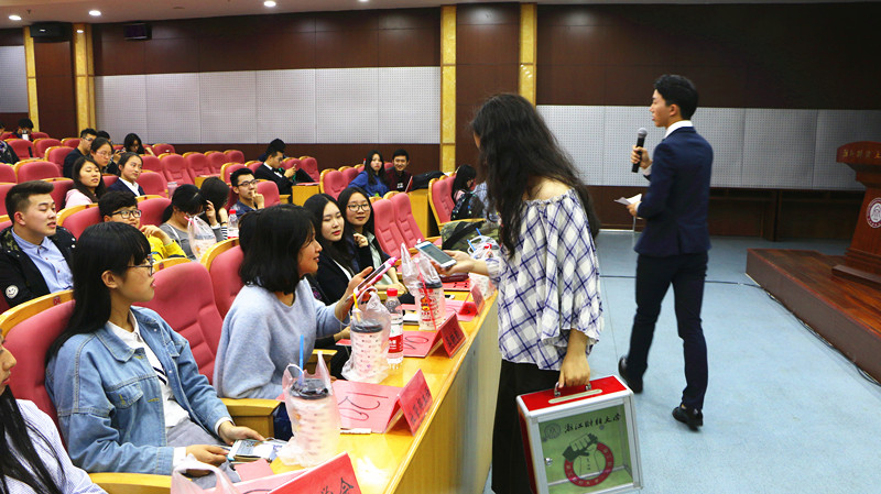 本次拍卖会总共有三个环节,分别是传统环节、“书香满溢,致梦于信”主题拍卖环节与创意拍卖环节。在第一环节,帽子、手链、手提包等拍品随着拍卖师的介绍一件件被抱走。“一元一信一意,一元一乐一趣”,在一元竞猜环节中,观众们只要出一元钱便能参与商品的价位竞猜,猜得与实价最接近的同学就能获得此拍品,所得得“一元钱”都将捐入一元钱工程。一时之间场面十分热闹,梳子、眼镜盒随着一元一元流入箱中,纷纷被猜中实价。在接下来的有奖竞猜环节中,同学们也纷纷举牌,踊跃参与回答。