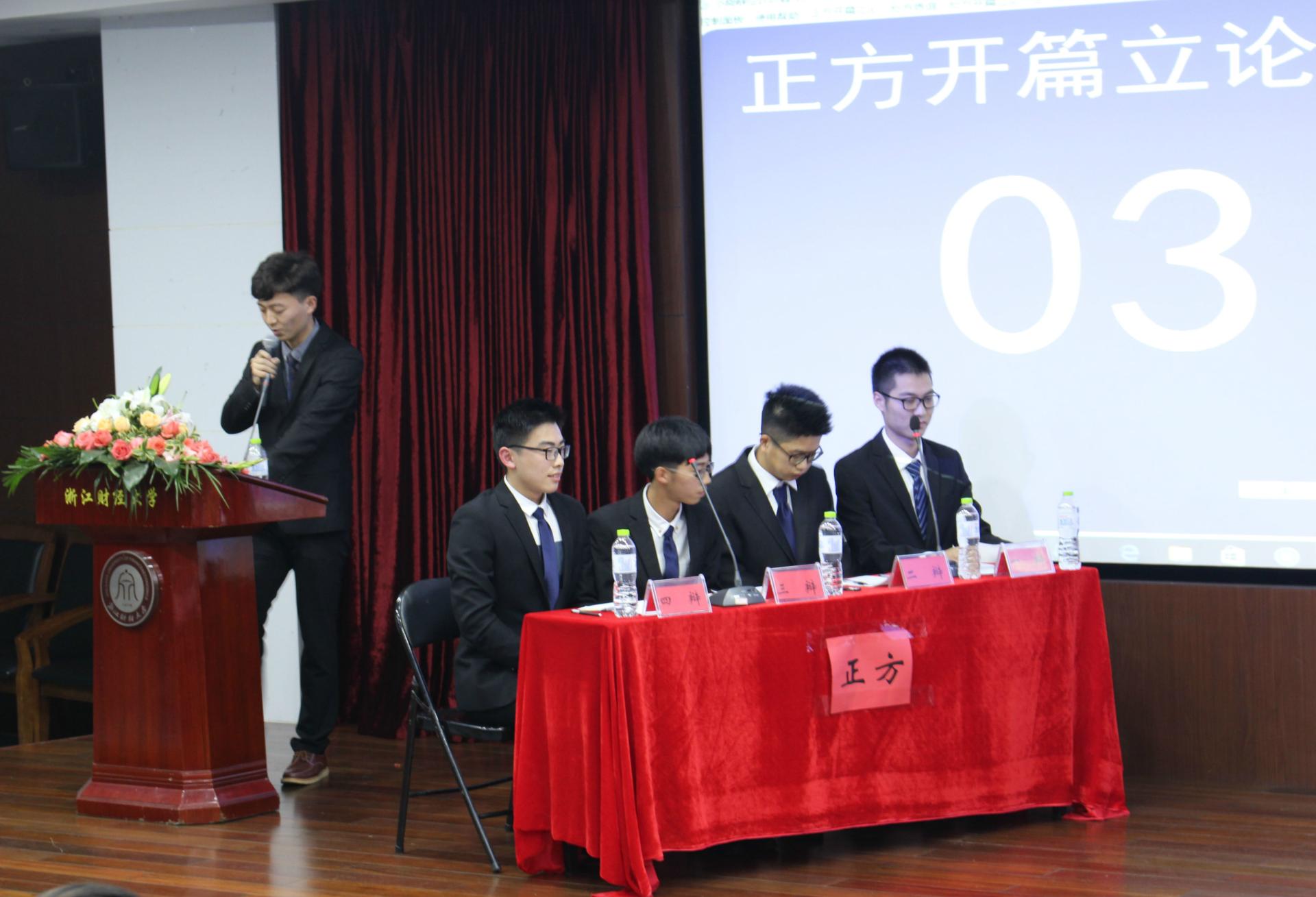在紧张的气氛中,第一场比赛季军赛率先开赛。该场比赛的辩题是侥幸心理是人性的优点还是缺点,在工商学院代表队和财税学院代表队之间展开激烈交锋,最后由正方工商学院赢得了该场比赛,获得季军。