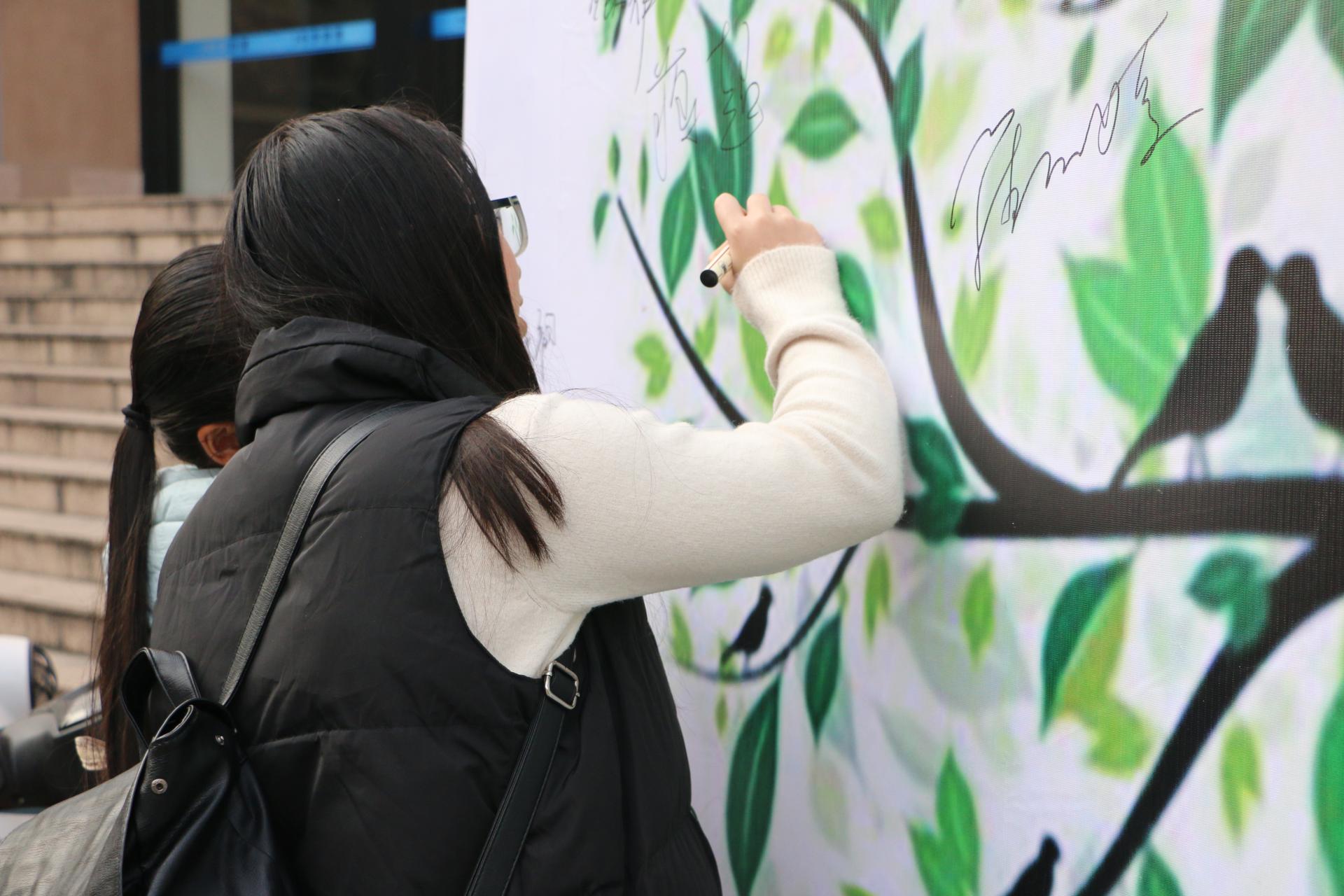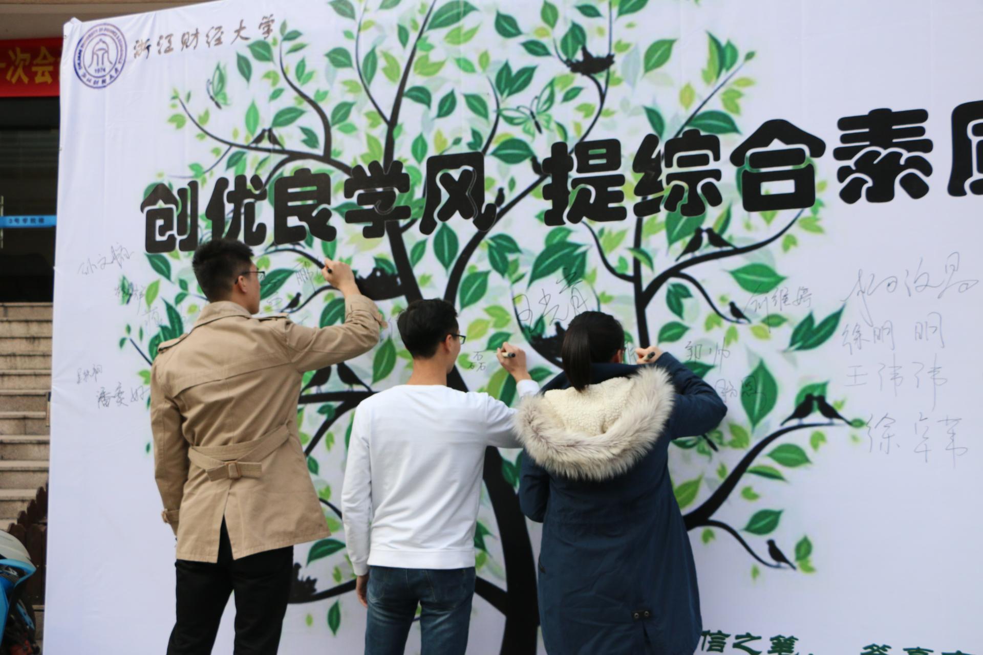 开展了 “考风考纪教育”规范承诺书活动。同学们纷纷响应,来到学院楼门口,在喷绘上签下名字,承诺必将遵守考纪,诚信应考,考出风采。