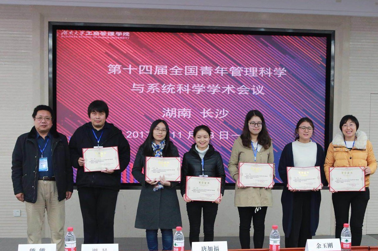 11月17日至19日,第十四届“全国青年管理科学与系统科学学术会议”在湖南大学召开。酷爱成人网 研究生杜和佳、周寒娴等同学应邀参加会议。杜和佳同学在会上报告的论文《互联网金融理财产品信用价差影响因素研究》荣获优秀论文。