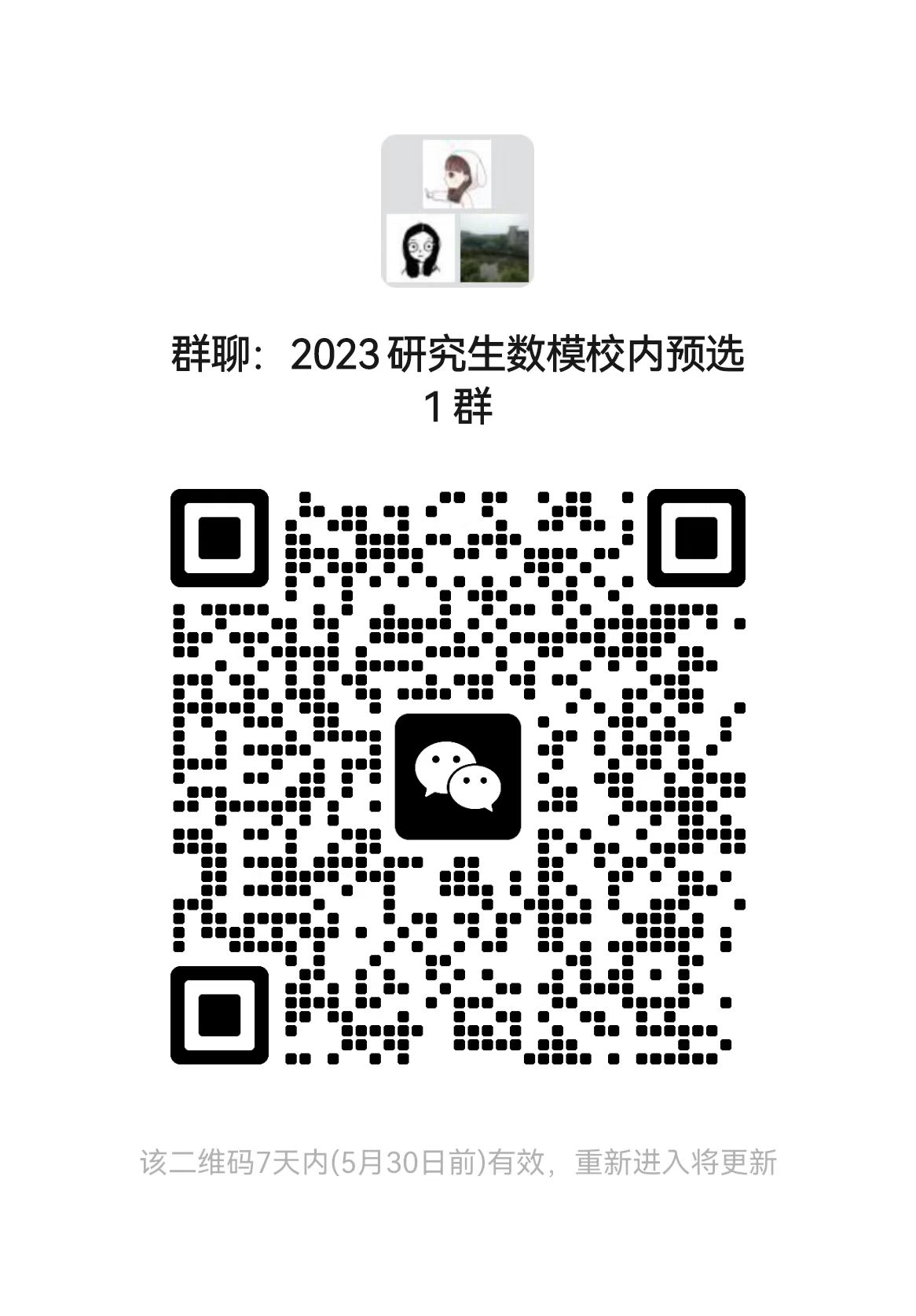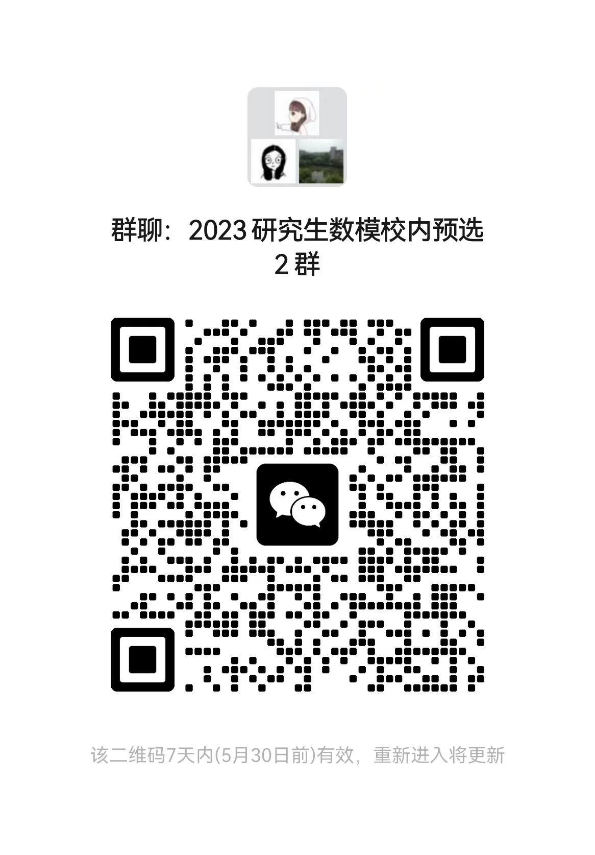 2. 报名方式:有参赛意向的同学可在5月30日前向学院研秘报名,各学院研秘应在5月31日前将报名学生名单(附件1)报研究生院(联系人:施淑珍 88173)。我校在读研究生报名后请扫码加入2023研究生数模校内预选1群,获我校2023年研究生入学资格的新生报名后请扫码加入2023研究生数模校内预选2群,实名进群,请勿加错。