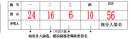 4.各大题得分须在试卷卷头评分表格栏登记,如试卷为同一位老师评阅的,试卷评阅人须在统分人签名处签字,如有多人评阅的,请相应评阅老师在所评阅的大题得分栏下面签字,统分老师在统分人签名处签名,具体(见下图)。