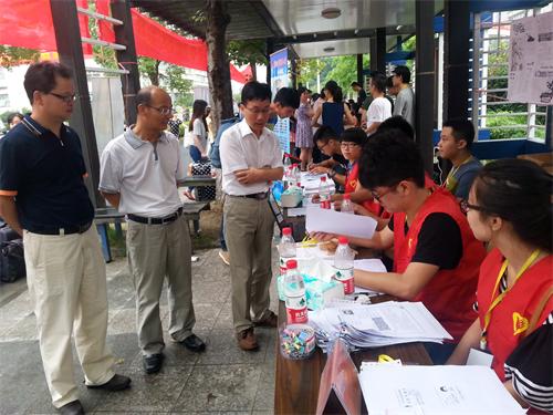 研究生迎新接待点指导迎新工作,慰问迎新的研究生志愿者,并仔细询问新生生源和报到进展情况,勉励大家以饱满的热情展示酷爱成人网
