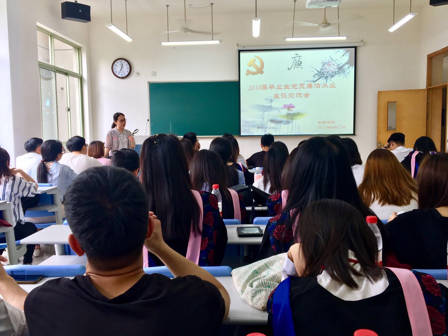 在3号楼101教室召开2018届毕业生党员廉洁从业教育座谈会。学院党委副书记叶秀出席会议,辅导员聂亚平及全体毕业生党员参加会议。
