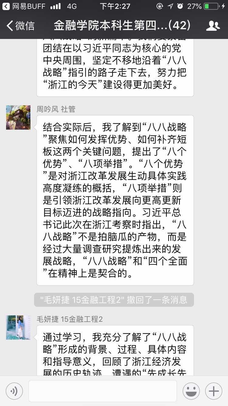 本科生第二党支部丰予倩认为:习近平总书记的“八八战略”为浙江省的发展指明了方向。作为浙江学生党员应该了解自己的家乡,清楚家乡的优势与特色。同时学习浙江的实干精神、担当精神与创造精神,勇立潮头,为家乡建设贡献自己的一份力量。研究生第一党支部李全超也表示:“八八战略”把从严治党、巩固和发展风清气正的良好政治生态放在重要位置,引领浙江不断推进党的建设,不断推进政府自身改革的创新探。“八八战略”实施得越深入、越持久,就越彰显出强大的引领力量。