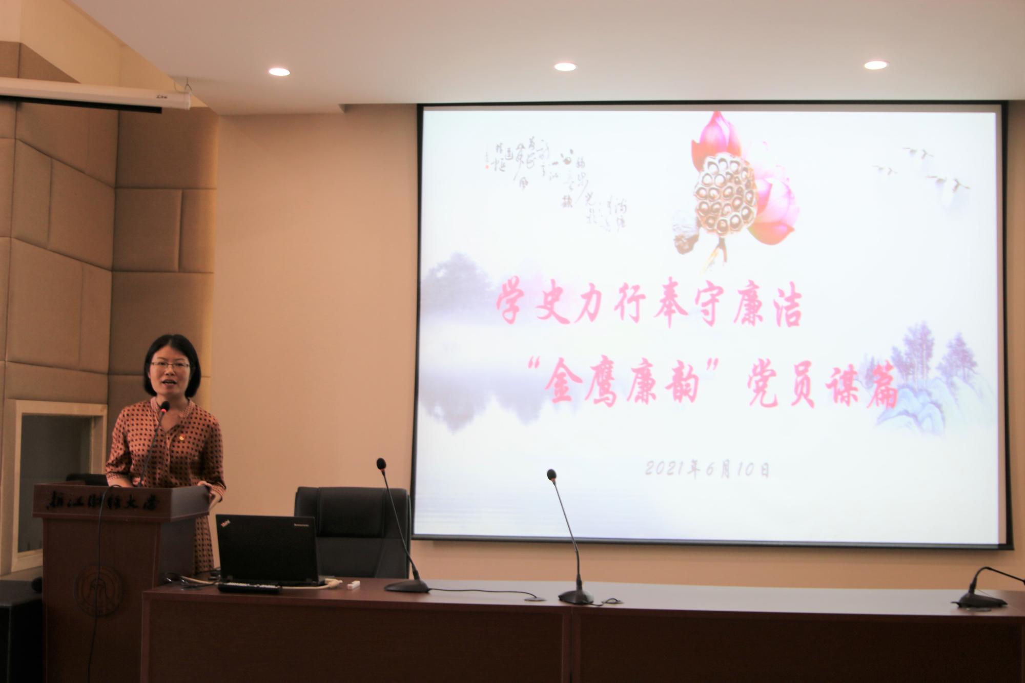 谢敏在仪式上宣读参加宣誓的新党员名单,并以《学史力行奉守廉洁 “金鹰廉韵”党员谋篇》为题给大家上廉洁教育党课。她强调,“大学生党员是党的未来,其清正守廉关乎党内的纯洁性,对保持党的生机有着重要的意义。”她结合学院的“金鹰廉韵”廉洁教育品牌建设,以及同学们在校生活学习中的实例,对新党员提出三点要求:主动开展廉政学习教育,树立廉洁意识;将思想内化为廉洁行为,养成廉洁习惯;积极影响和带动身边同学,营造廉洁的氛围。希望大家要对标高要求,严格强自律,系好新党员入党的第一粒扣子!