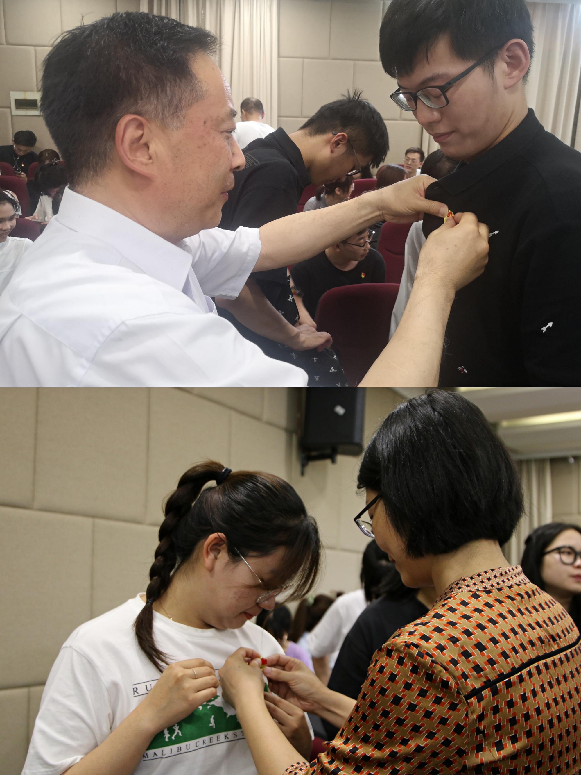 随后,由与会的老党员为新发展党员佩戴党徽。全体人员起立,面向鲜艳的党旗,举起右拳,在蔡国金的带领下庄严宣誓,“我志愿加入中国共产党,拥护党的纲领......”同志们以饱满的精神状态,铿锵有力的誓言,表明了自己为党和国家奋斗终身的坚定决心。
