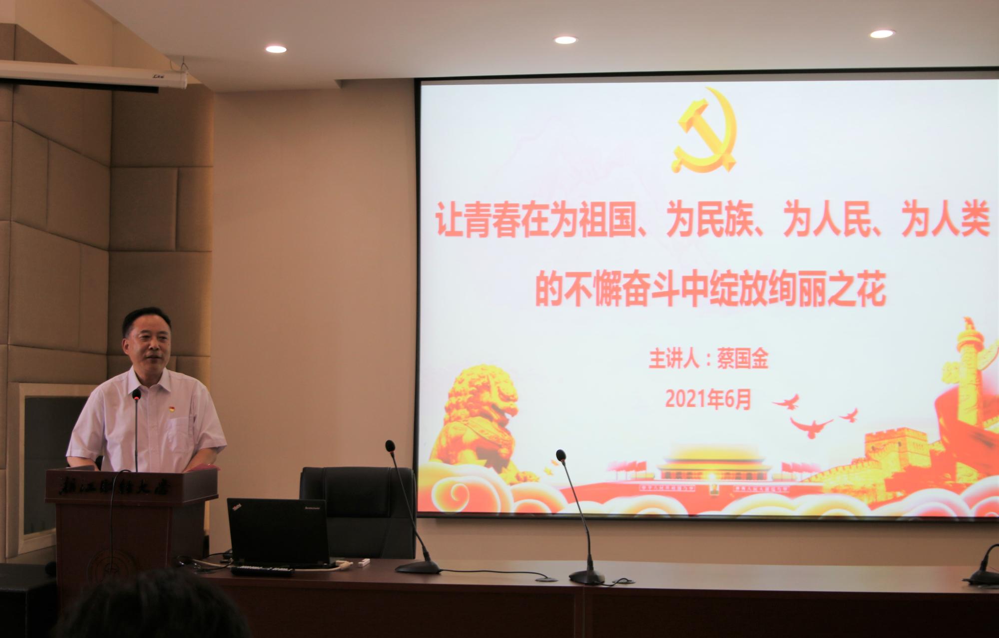 活动伊始,蔡国金代表学院党委向120名光荣跨进组织大门的新党员表示热烈的欢迎和祝贺,并给大家讲授《让青春在为祖国、为民族、为人民、为人类的不懈奋斗中绽放绚丽之花》专题党课。他结合学习《中国共产党章程》、学党史、学《中国共产党普通高校基层组织工作条例》等内容,对新党员提出了三点希望:一是要加强政治理论学习,不断提高政治思想素质;二是要认真参加组织生活,不断加强党性锻炼;三是要不忘初心牢记使命,充分发挥先锋模范作用。蔡书记激励广大新党员“无论以后在任何时候、任何地方、从事任何行业,都要时刻牢记自己是一名共产党员,坚持以党章的标准来严格要求自己,时时处处发挥好党员的模范带头作用,为中华民族的伟大复兴贡献自己的力量。”