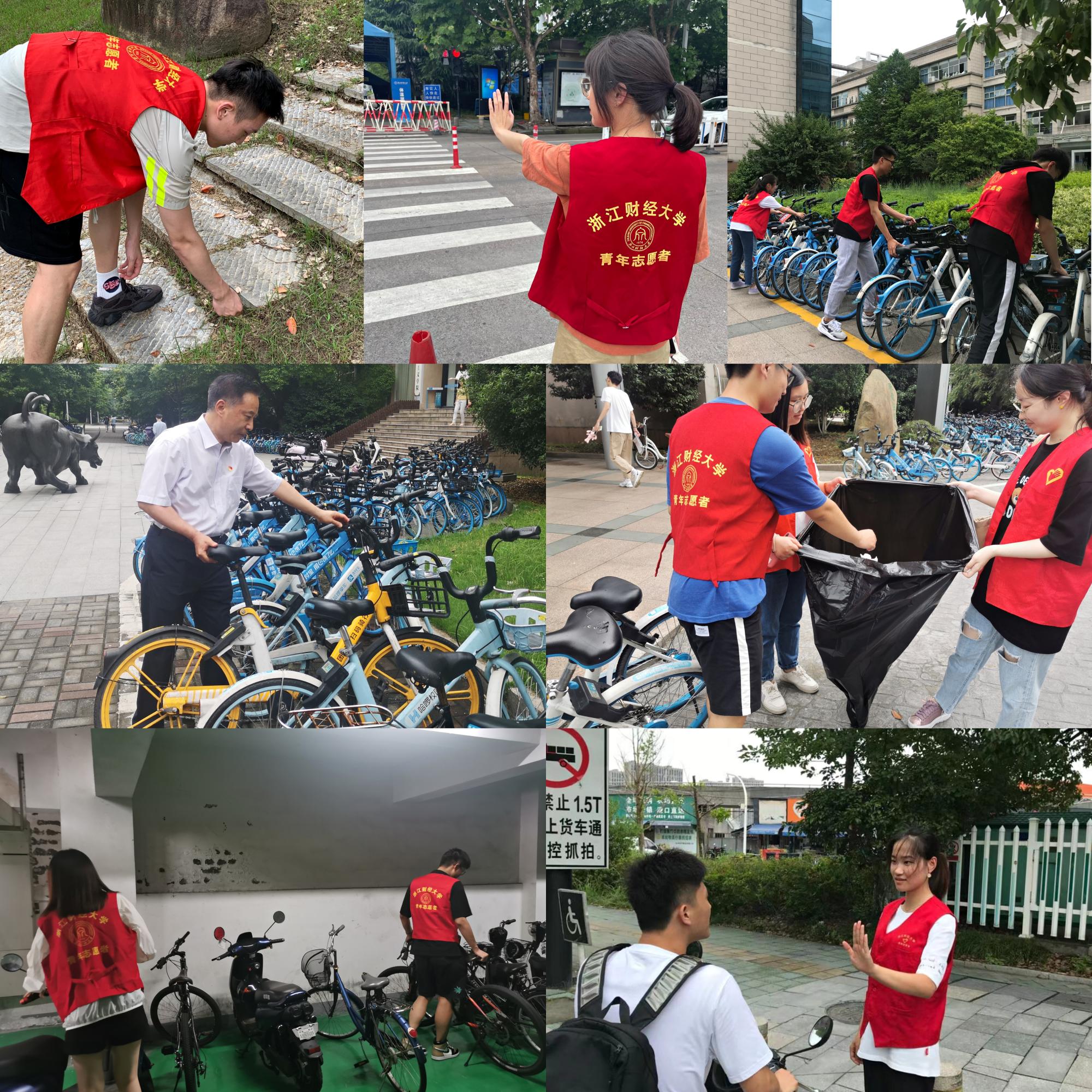为更好的践行党史学习教育“我为群众办实事”要求,仪式结束后,学院党委组织党员们身着红马甲,以支部为单位到学院楼、教学楼、图书馆、后山、十字路口等地,通过交通志愿指引、校园环境清洁、非机动车摆放等形式开展“我服务,我先行”主题党日活动。党员们在志愿活动中亮明身份、微笑服务、积极作为,以实际行动筑牢初心使命,发挥党员先锋模范带头作用,在校园各角落已然形成了一道道靓丽的风景线。