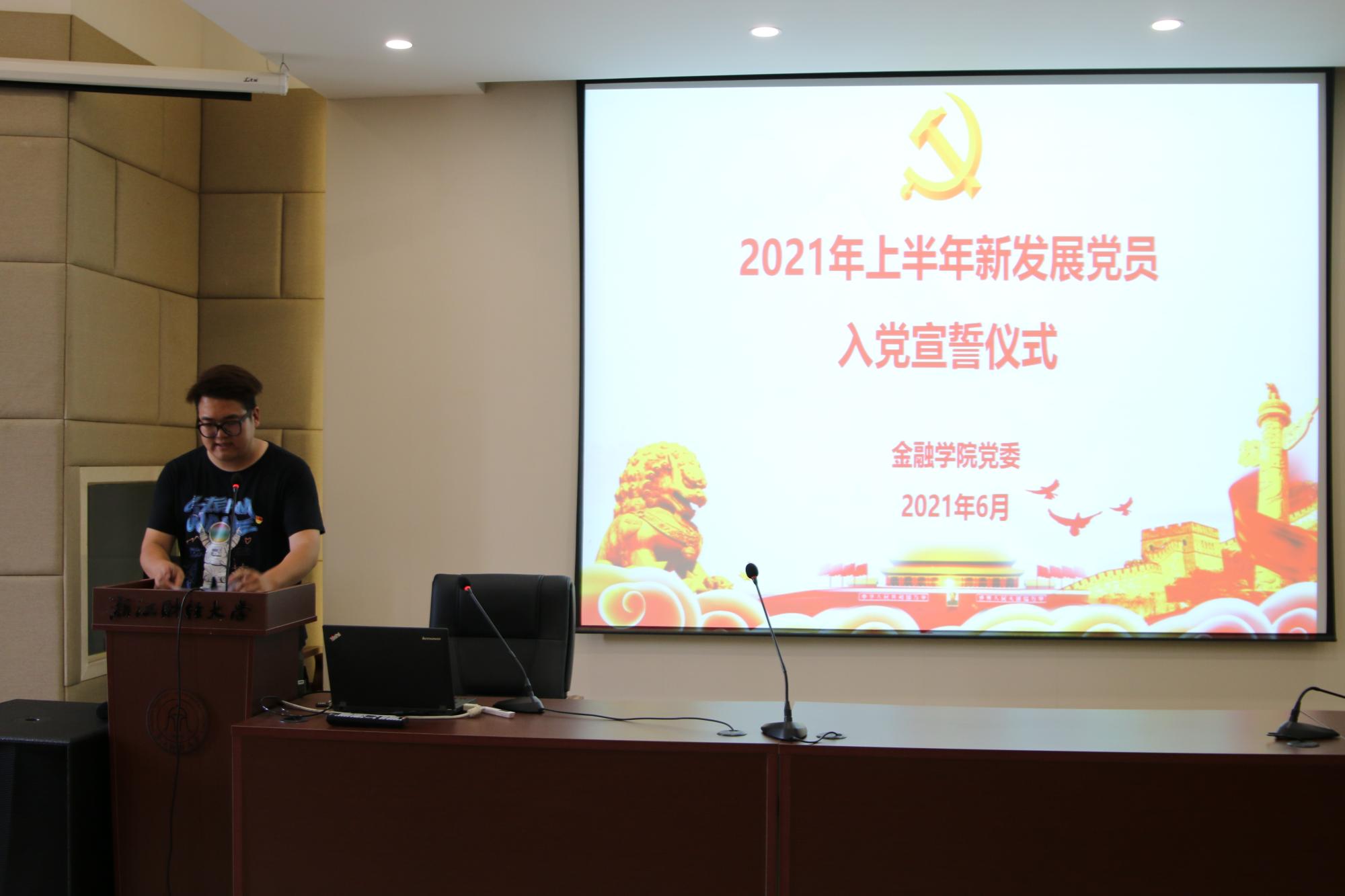 在3号楼202报告厅举行2021年上半年新发展党员入党宣誓仪式暨主题党日活动。学院党委书记蔡国金、党委副书记谢敏、各学生党支部书记、老党员代表、2021年上半年新发展的1名教工党员和119名学生党员参加活动。活动由专职组织员翟丽媛主持。