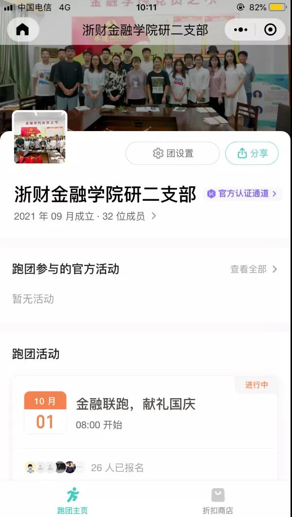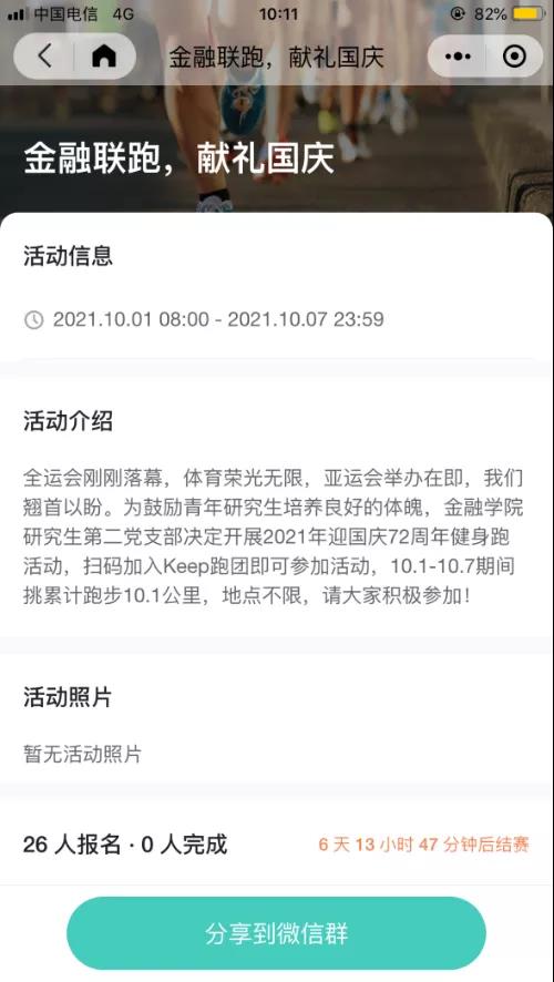 研究生第二党支部开展三项特色活动:Keep 跑团趣味路线健身跑、支付宝行走捐、蚂蚁森林“云种树”。邀请支部党员与积极分子一起参加,挑战国庆期间个人累计跑步10.1公里;将步数转化为公益金捐给有需要的人;通过支付宝收集低碳能量,在蚂蚁森林合种一棵树,以集体之名将树种植到祖国治沙一线。强身健体,低碳环保,奉献爱心,欢度国庆!