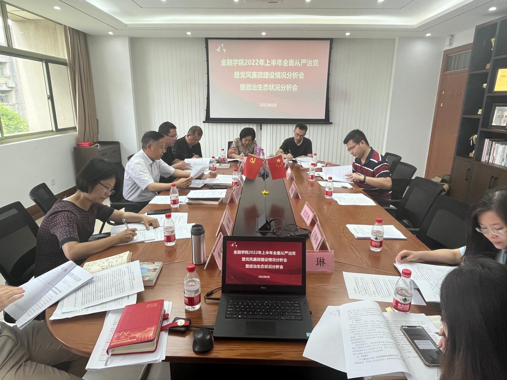 召开2022年上半年全面从严治党、党风廉政建设情况分析会暨政治生态建设状况分析会。学院党政领导班子成员、党委委员、系主任、部门主要负责人代表出席会议。会议由学院党委书记蔡国金主持。