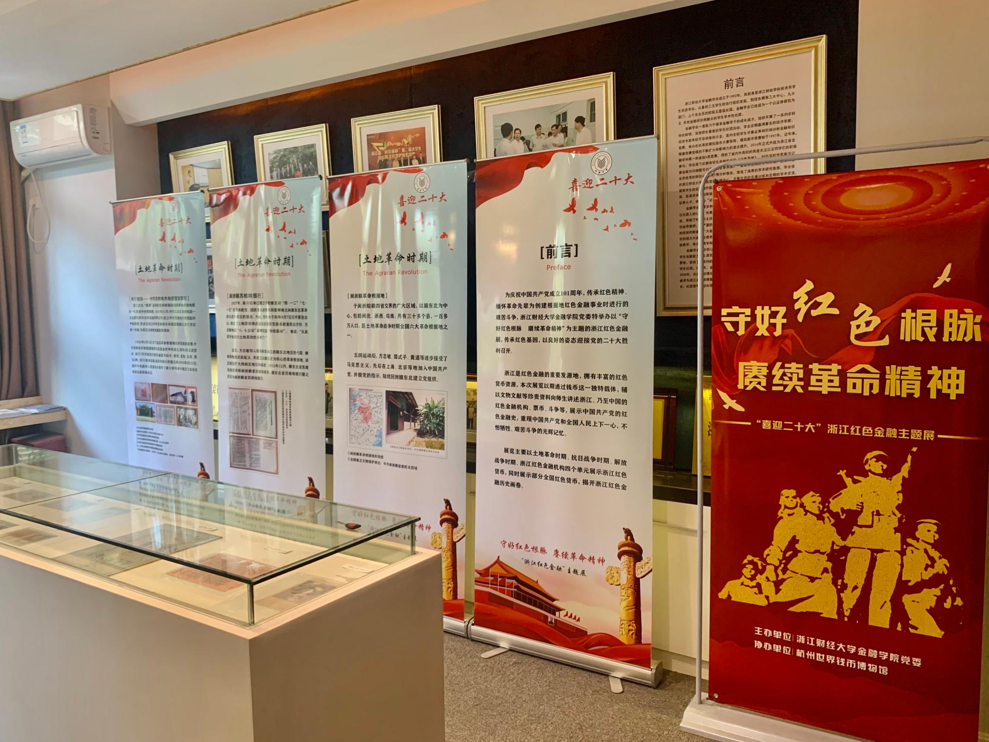 浙江是中国革命红船的起航地,拥有丰富的红色资源。本次展览以期通过钱币这一独特载体,辅以文物文献等珍贵资料向师生讲述浙江的红色金融机构、斗争故事、票币等,展示中国共产党的红色金融史,重现中国共产党和全国人民上下一心、不怕牺牲、艰苦斗争的光辉记忆。展览主要从土地革命时期、抗日战争时期、解放战争时期、浙江红色金融机构四个单元展示浙江和部分全国红色货币,向大家揭开浙江红色金融历史画卷。