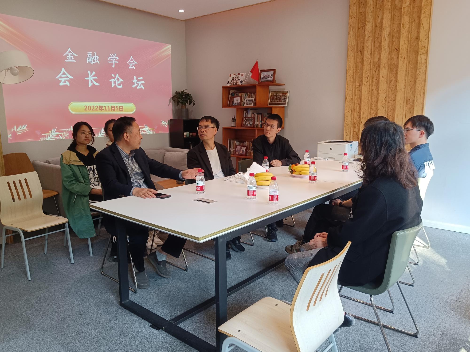 本次金融学会会长论坛在金融学会会史馆举行,98届会长李启兵、21届会长来怡霞、23届会长方嘉鹏、现任会长王煜诚以及金融学会指导老师吴轶韵参加本次活动,他们听取了会史馆发展近况,分享了学习经历和工作经验,并为金融学会的发展建言献策,对金融学会的未来寄予厚望。此外,92届邹文会长会前亲临会史馆指导交流。