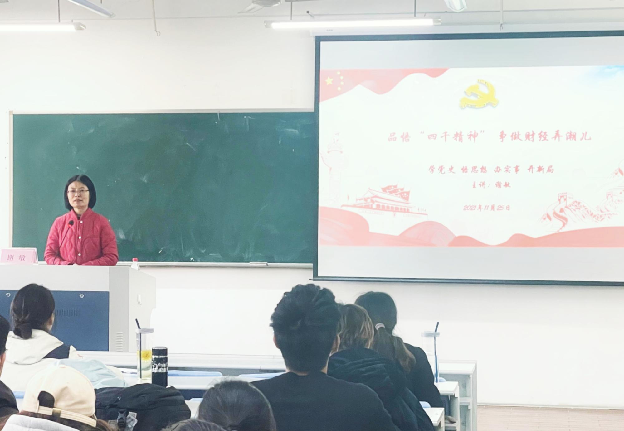 党委副书记谢敏以《品悟“四千精神” 争做财经弄潮儿》为题给大家上了一堂生动的党课。她以中国共产党人精神谱系第一批伟大精神正式发布为切入点,具体介绍了蚂蚁岛精神、大陈岛垦荒精神、海峡精神等诞生发展于浙江的伟大精神。着重讲解了“建党精神”“四千精神”,强调浙江的改革发展离不开对“四千精神”的彰显和弘扬,鼓舞学员们自强不息、艰苦奋斗,坚定理想和信念,继续为实现人民对美好生活的向往不懈努力,为中华民族的伟大复兴贡献青春和力量。