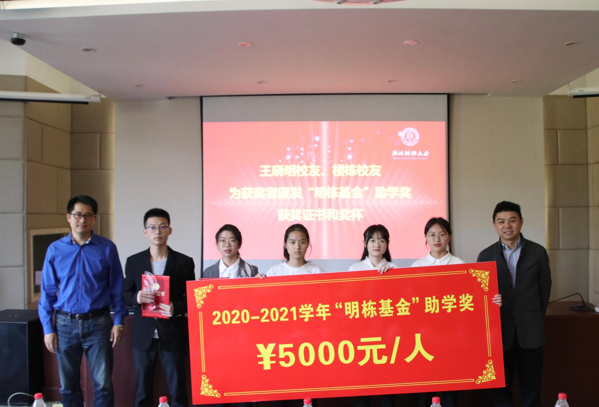 紧接着,“明栋基金”管理委员会秘书长吕霞校友向大家介绍了此次助学奖评审流程,校党委学工部部长曹桢,校党委研工部副部长张梅芳分别宣读2020-2021学年“明栋基金”助学奖获奖本科生和研究生名单。“明栋基金”王晓明和楼栋两位校友亲自为获奖学生颁发奖杯和证书。