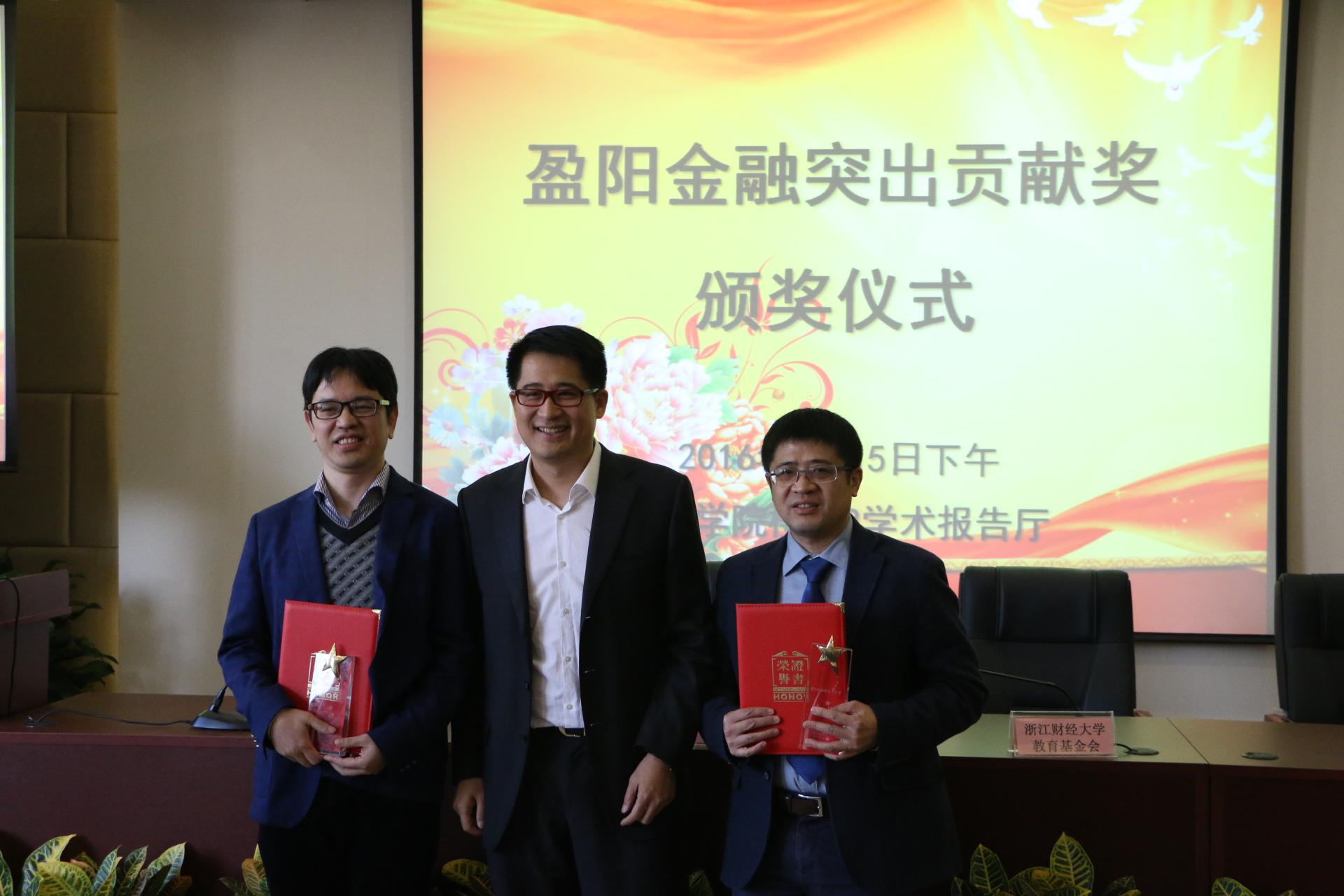 紧接着,“盈阳金融突出贡献奖”颁奖仪式也在此举办。陈荣达教授与胡旭阳教授获得盈阳金融突出贡献奖金奖,由楼栋校友为他们颁奖。