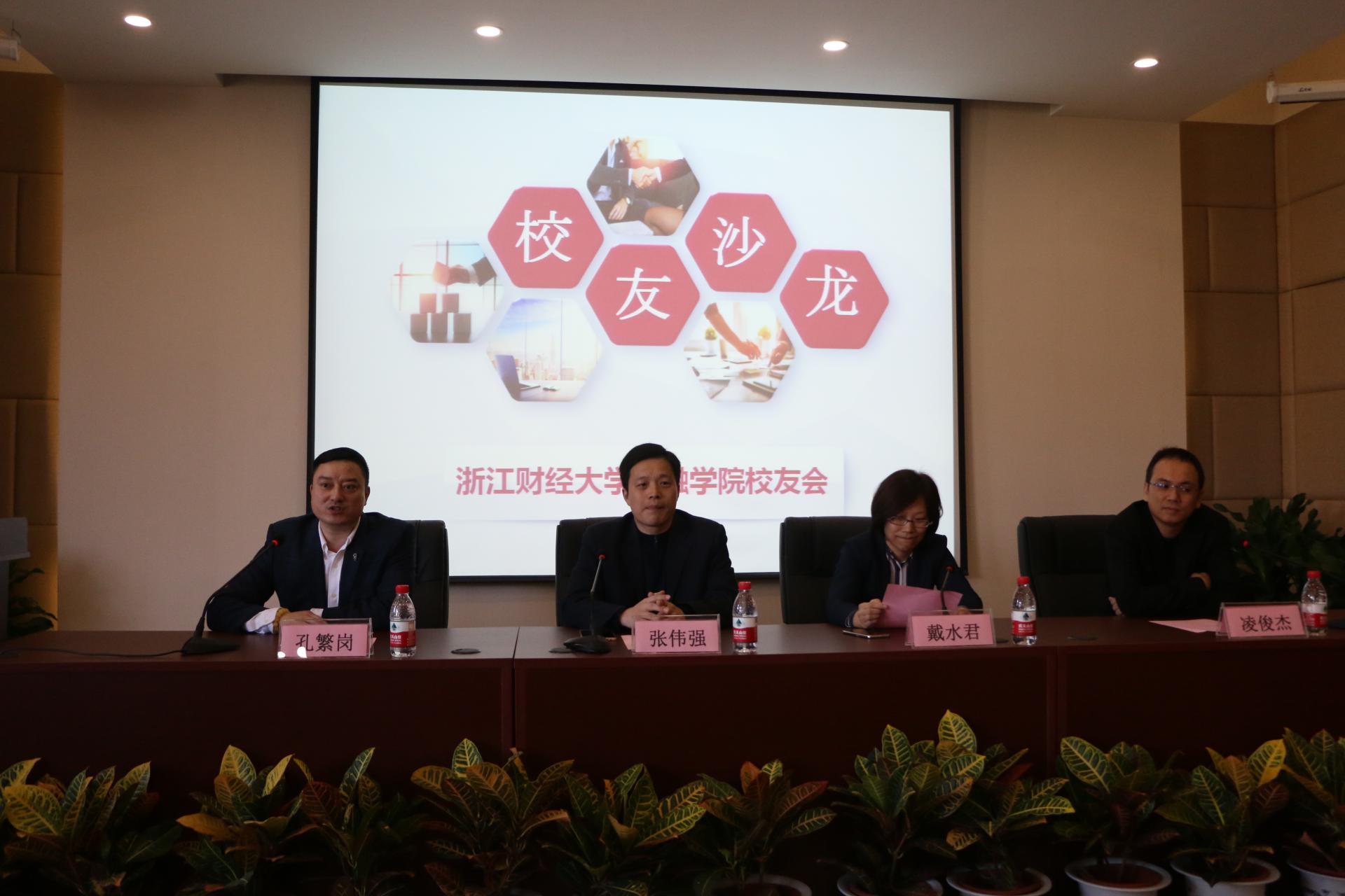 校友返校日系列活动之校友沙龙在学院楼202报告厅顺利进行。在学院校友会理事会的积极推动下,分别邀请了张伟强(95届校友,杭州欢泰健康管理有限公司高级经济师、执行董事)、戴水君(97届校友,金石资源集团股份有限公司副总裁、董事会秘书)、凌俊杰(00届校友,浙江巴沃资产管理有限公司董事长)三位不同领域的优秀校友,向同学们分享了关于职业规划和创新创业的想法。99届校友、浙江盈阳资产管理股份有限公司总经理孔繁岗先生作为主持人出席。