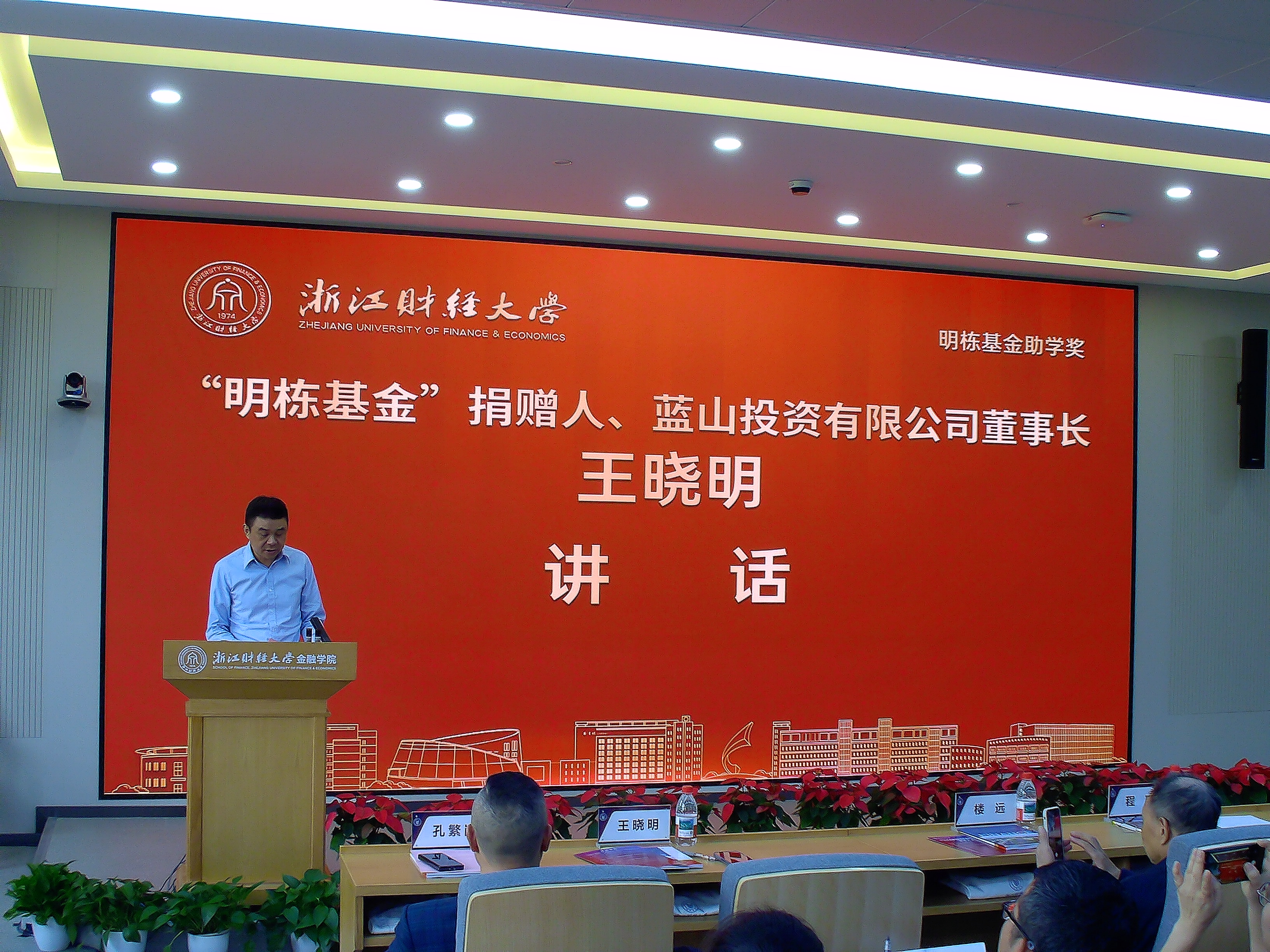 退休教师王春发、徐敏,“明栋基金”捐赠人、蓝山投资有限公司董事长、86届校友王晓明,蓝山投资有限公司总裁、97届校友王柳琳,“价值投资播种基金”捐赠人、杭州凯风科技有限公司总经理、98届校友李启兵,盈阳资产代表、盈阳金融科技学院副院长、99届校友孔繁岗,“明栋基金”管理委员会秘书长王丽荣,酷爱成人网