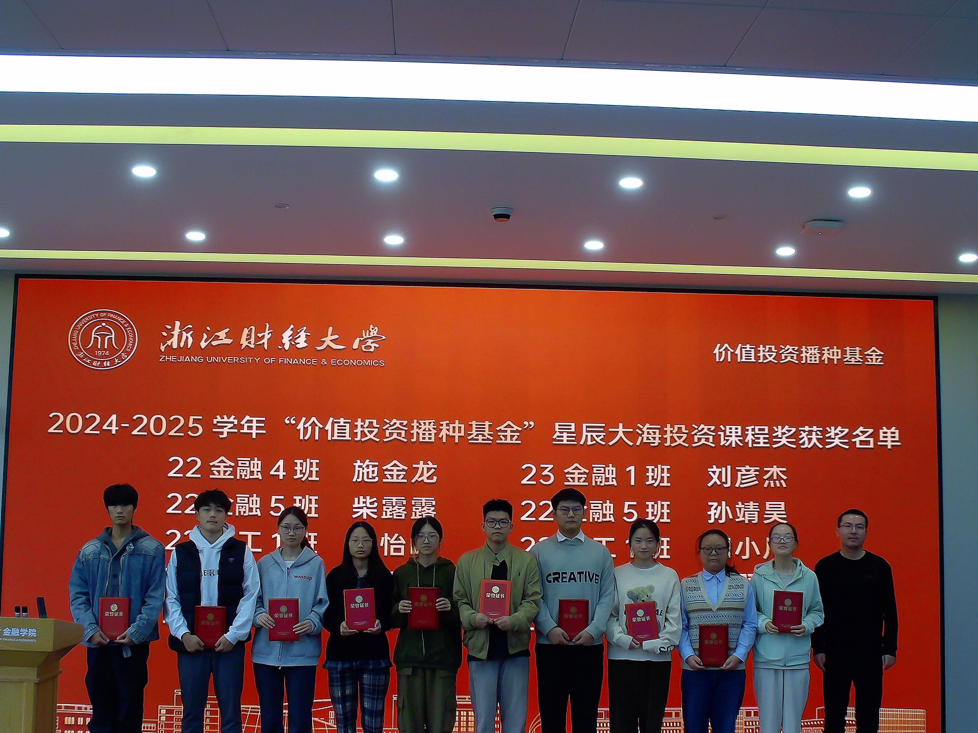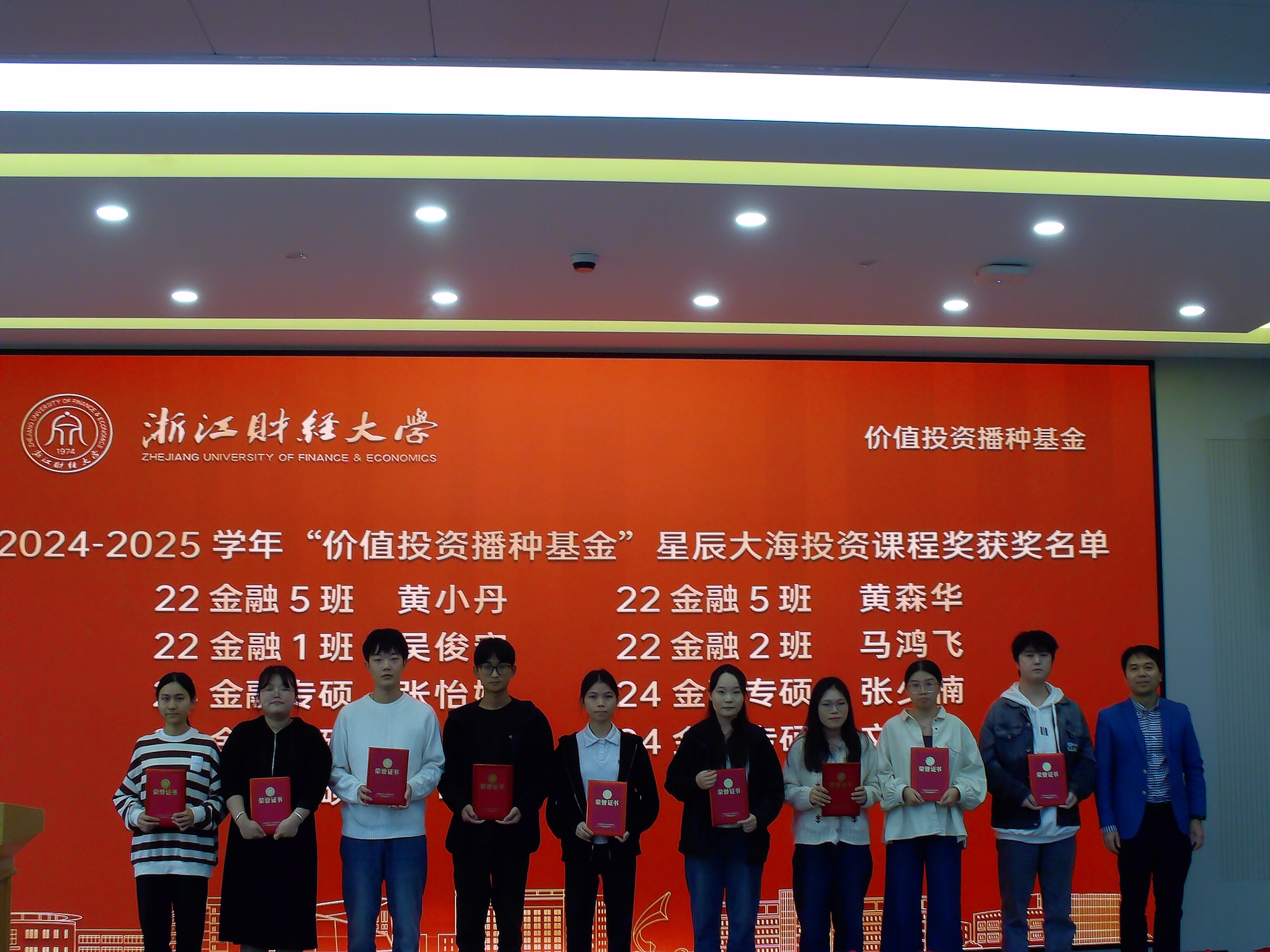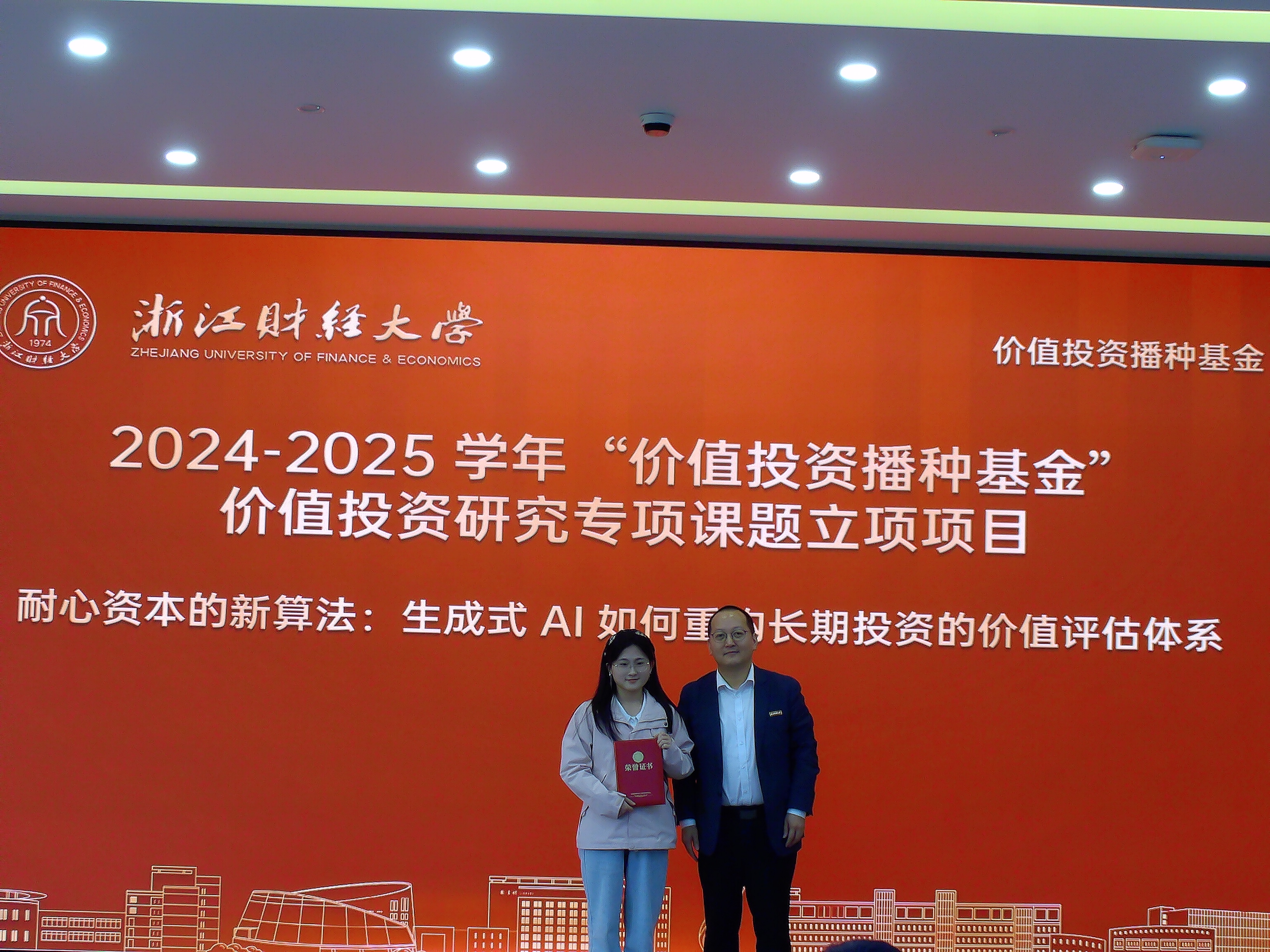 朴哲范、钟立新、武鑫、邹静等四位优秀教师获得“价值投资播种基金”之“匠人园丁教学科研鼓励奖”;王聪聪、龙怀钢、陈梦涛、姚钟玮、刘建和、胡旭阳、徐峰等7位老师获得基础性课程建设奖;曹淑花同学负责的《耐心资本的新算法:生成式AI如何重构长期投资的价值评估体系》在“价值投资研究专项课题”中成功立项;2024—2025学年,张怡娟、张少楠、鲜蕊、文浈钦、佟可新、黄小丹、黄森华、吴俊宏、马鸿飞、符羽蒙、徐小慧、孙天佳、施金龙、刘彦杰、柴露露、孙靖昊、罗怡峰、周小川、马媛媛等20位同学获得“星辰大海投资课程奖”奖学金。