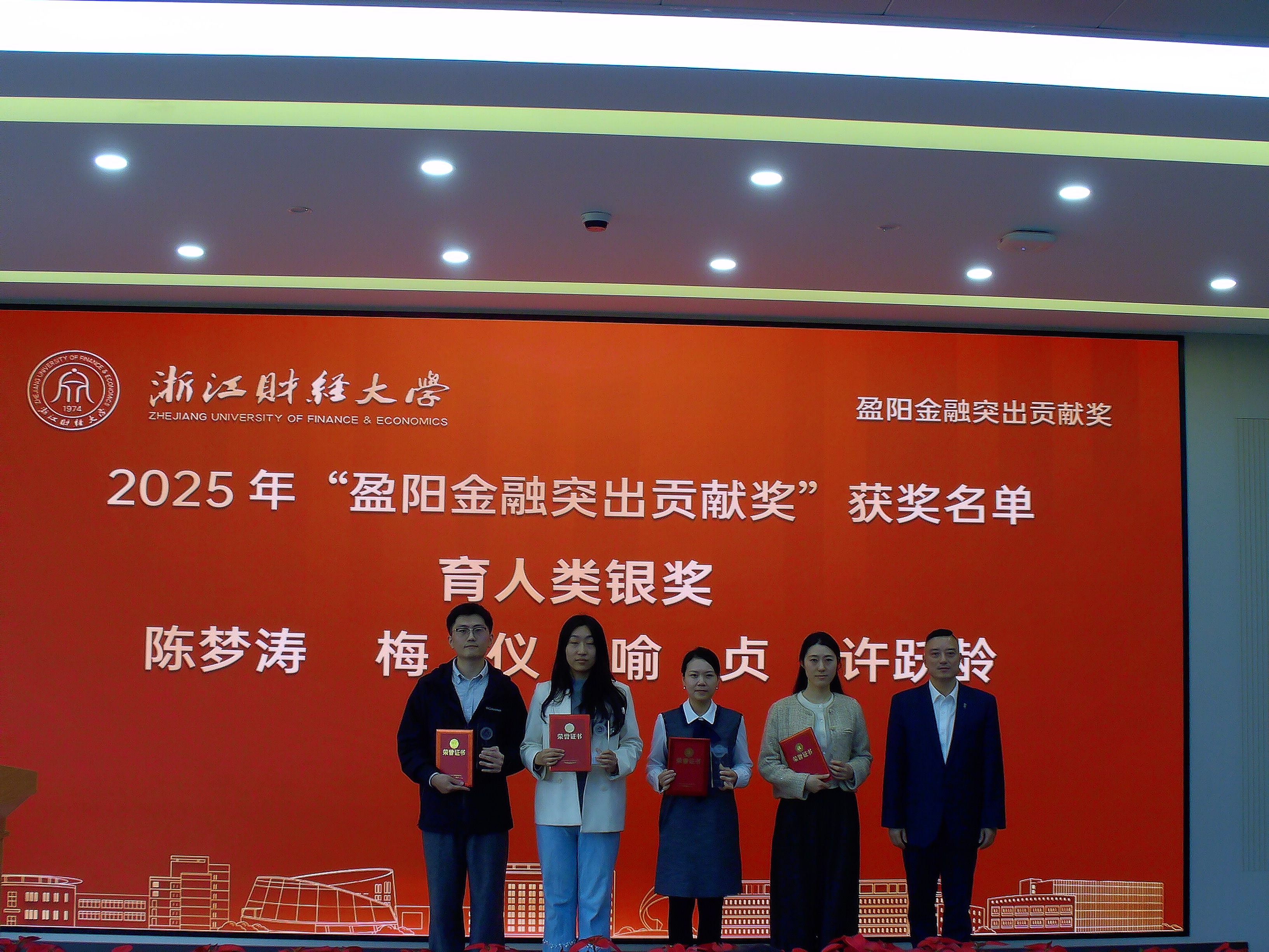 “盈阳金融突出贡献奖”自2016年由1998届校友楼栋捐赠设立,通过对学院突出贡献老师的奖励,不断激励学院老师积极开展科学研究,教书育人、爱岗敬业、乐于奉献、求真务实、开拓创新。马亦群老师获特殊功勋类金奖,王春发、徐敏老师2位老师获特殊功勋类银奖。陈梦涛、梅仪、喻贞、许跃龄4位老师获育人类银奖。