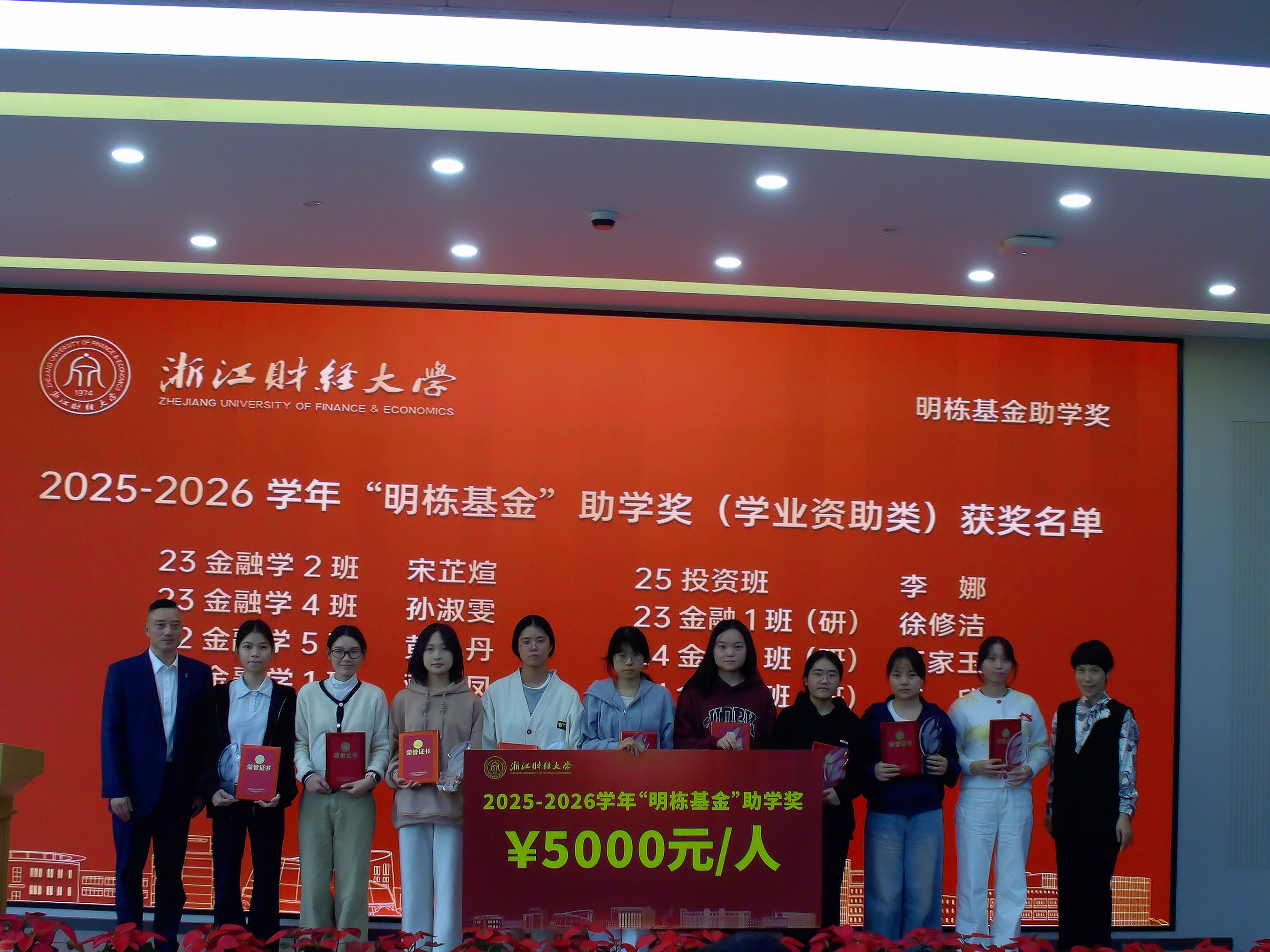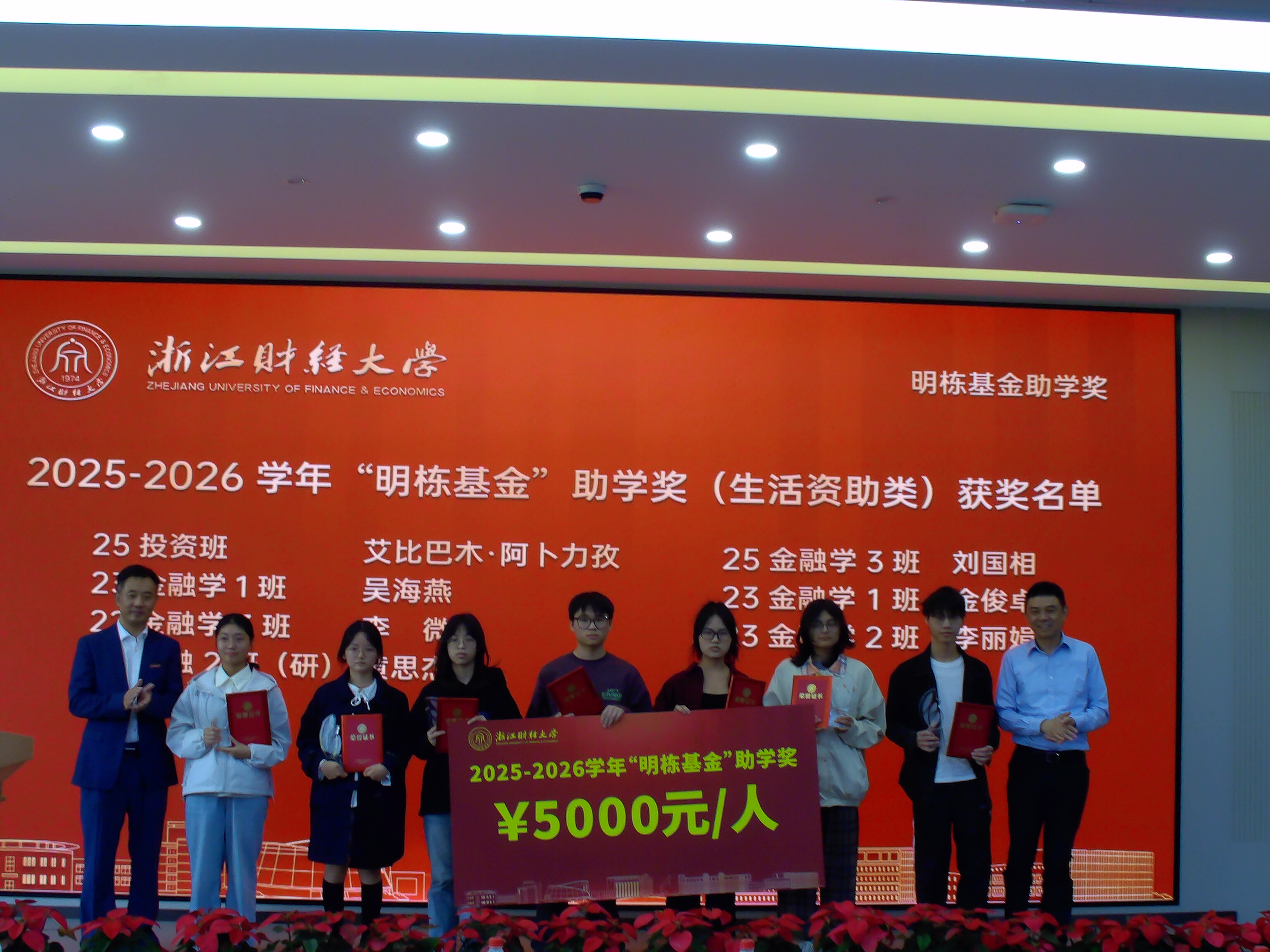 1986届校友王晓明、1998届校友楼栋于2014年共同捐赠500万元设立,2016年正式启动评审,至今已走过整整十年历程。大会现场播放的《拾光故事》短片,以鲜活的画面回顾了基金颁发十年来的历程。本次共有艾比巴木·阿卜力孜、刘国相、吴海燕、黄思杰、金俊卓、李微、李丽娟、李娜、宋芷煊、孙淑雯、黄小丹、蒋经凤、夏佳诺、徐修洁、汪家玉、王欣等16名同学获得“明栋基金”助学奖。