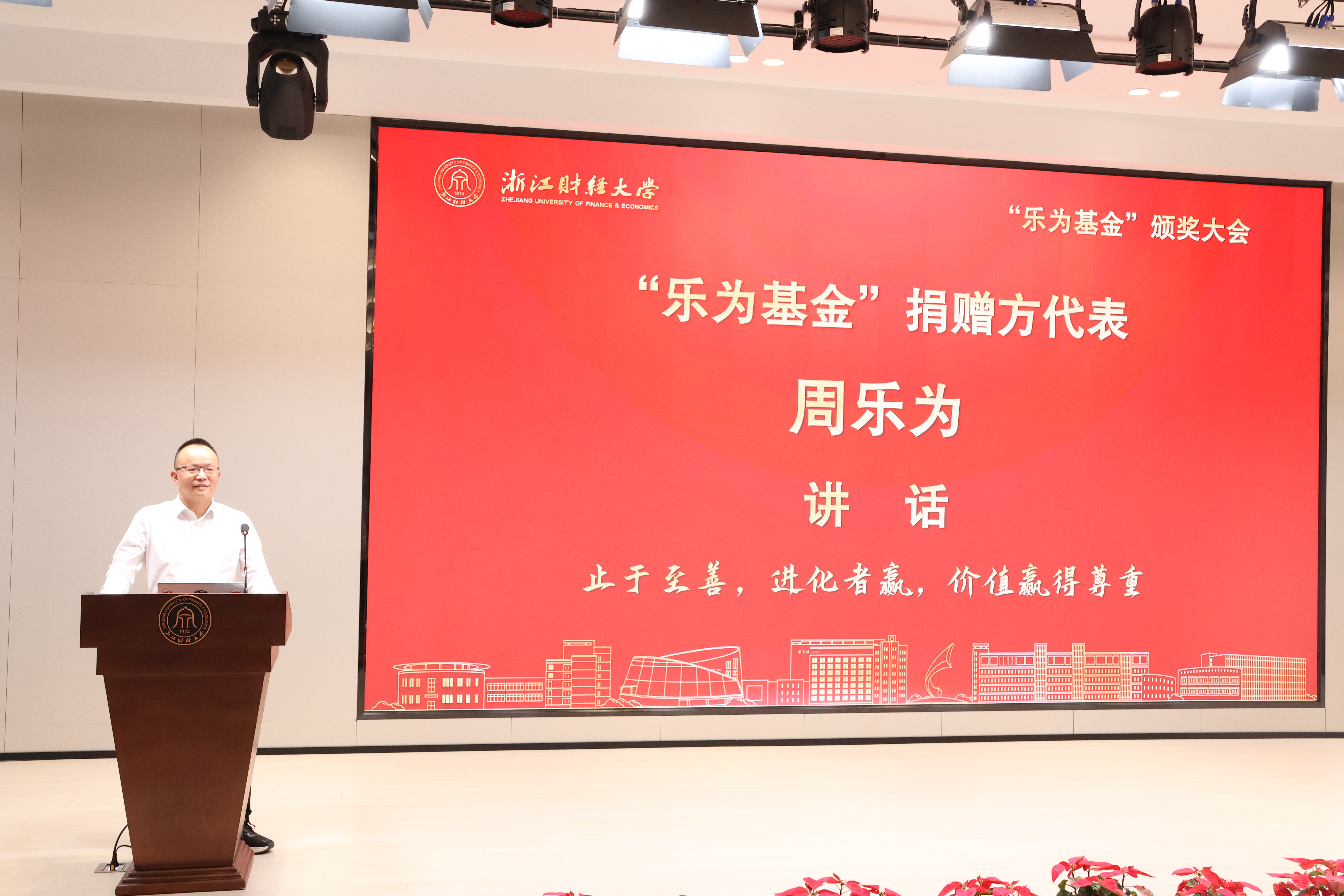 副校长何贤杰在颁奖大会上致辞,他充分肯定了“乐为基金”在推动学校教育教学、激励师生成长方面所发挥的积极作用,并对周乐为等校友及社会各界人士长期以来对母校的关心与支持表示衷心感谢。