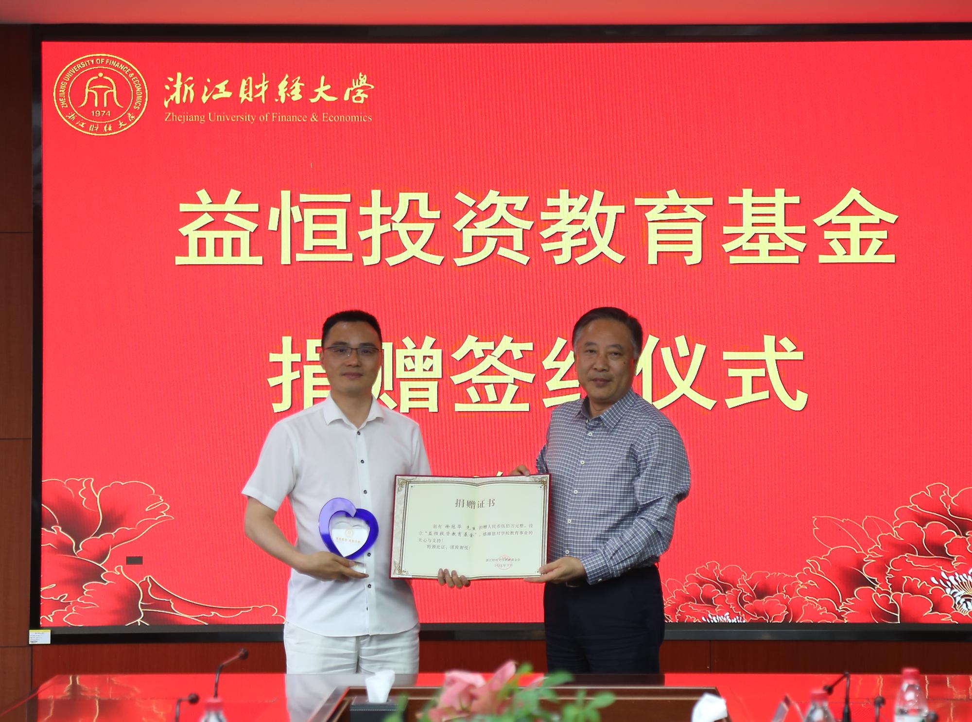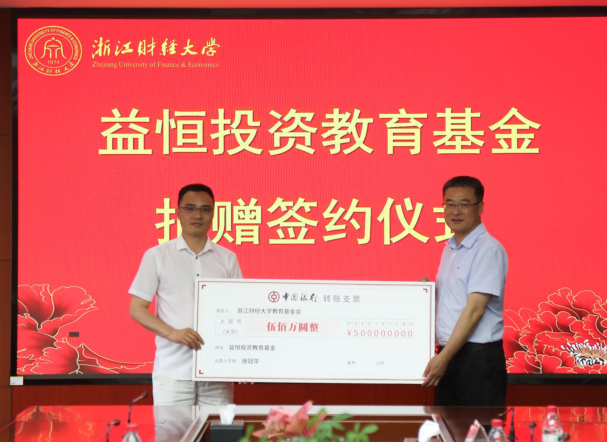 捐赠500万元,设立“益恒投资教育”基金。校党委书记李金昌,党委委员、副校长徐晓东,浙江益恒投资管理有限公司董事长徐冠华、联合创始人吴丹,浙江海达国际文教信息有限公司董事长张坚,浙江银万斯特投资管理有限公司董事长杜飞磊,浙江益恒投资管理有限公司交易总监章永成、研究总监田黄达,党委办公室主任范建锋,社会合作办主任张红英,酷爱成人网
