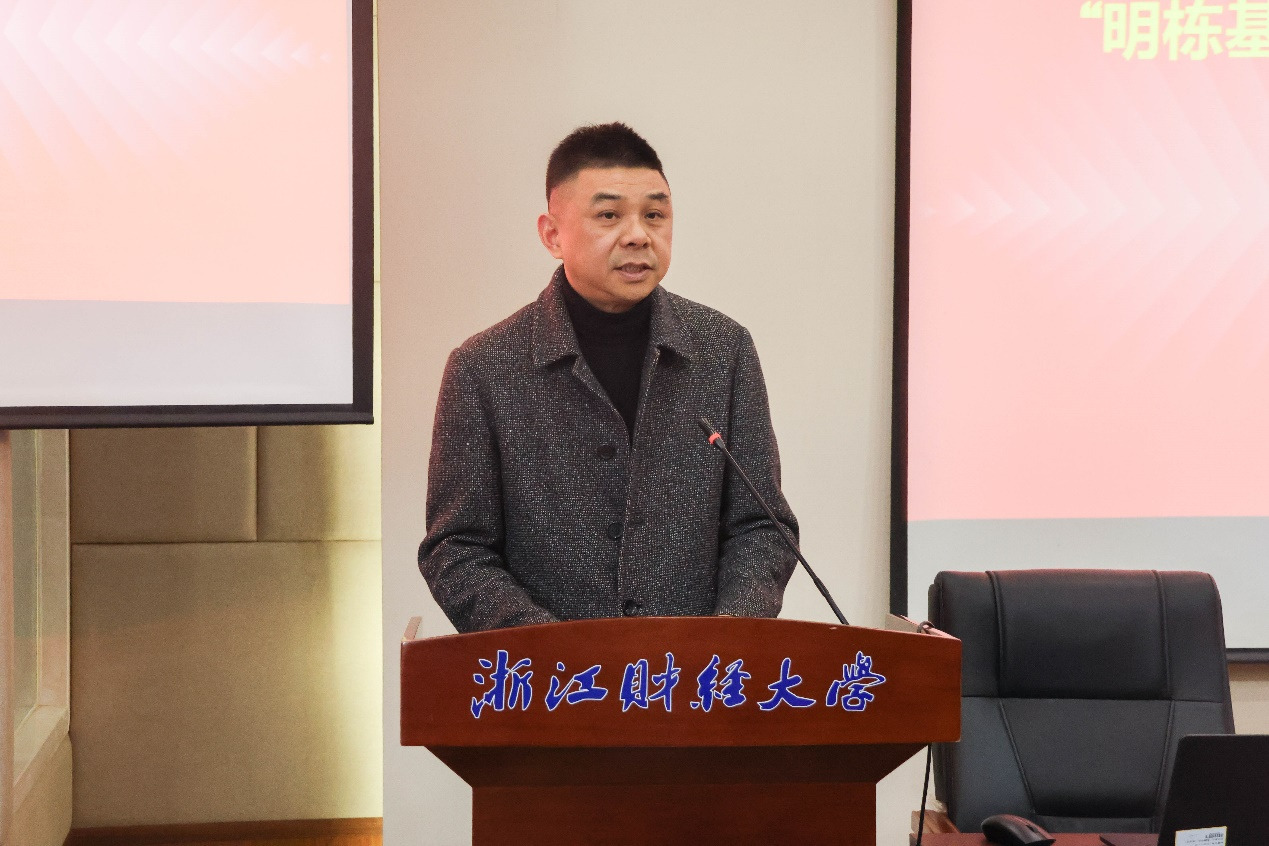 随后,“明栋基金”捐赠人、蓝山投资有限公司董事长王晓明讲话。他对获奖学生表示衷心祝贺,勉励各位学子能够以荣誉为动力,坚定地走好自立自强、成长成才的每一步,成为这份责任的传承者、使命的践行者。最后,他勉励大家能够勇敢地设定目标,坚定地制定计划,矢志不渝地去实现。