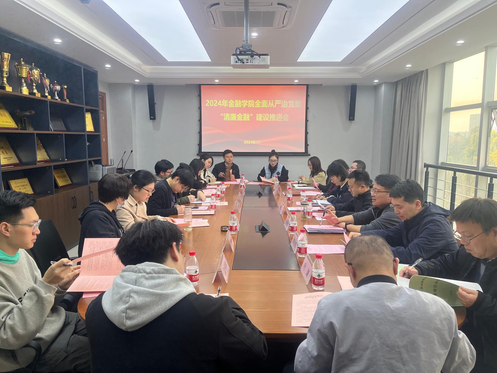 召开2024年全面从严治党暨“清廉金融”建设推进会。学院领导班子、党委委员、纪委委员、各系(办公室)主任、党支部书记、研究生党建指导老师参加会议,会议由学院党委书记黄文礼主持。