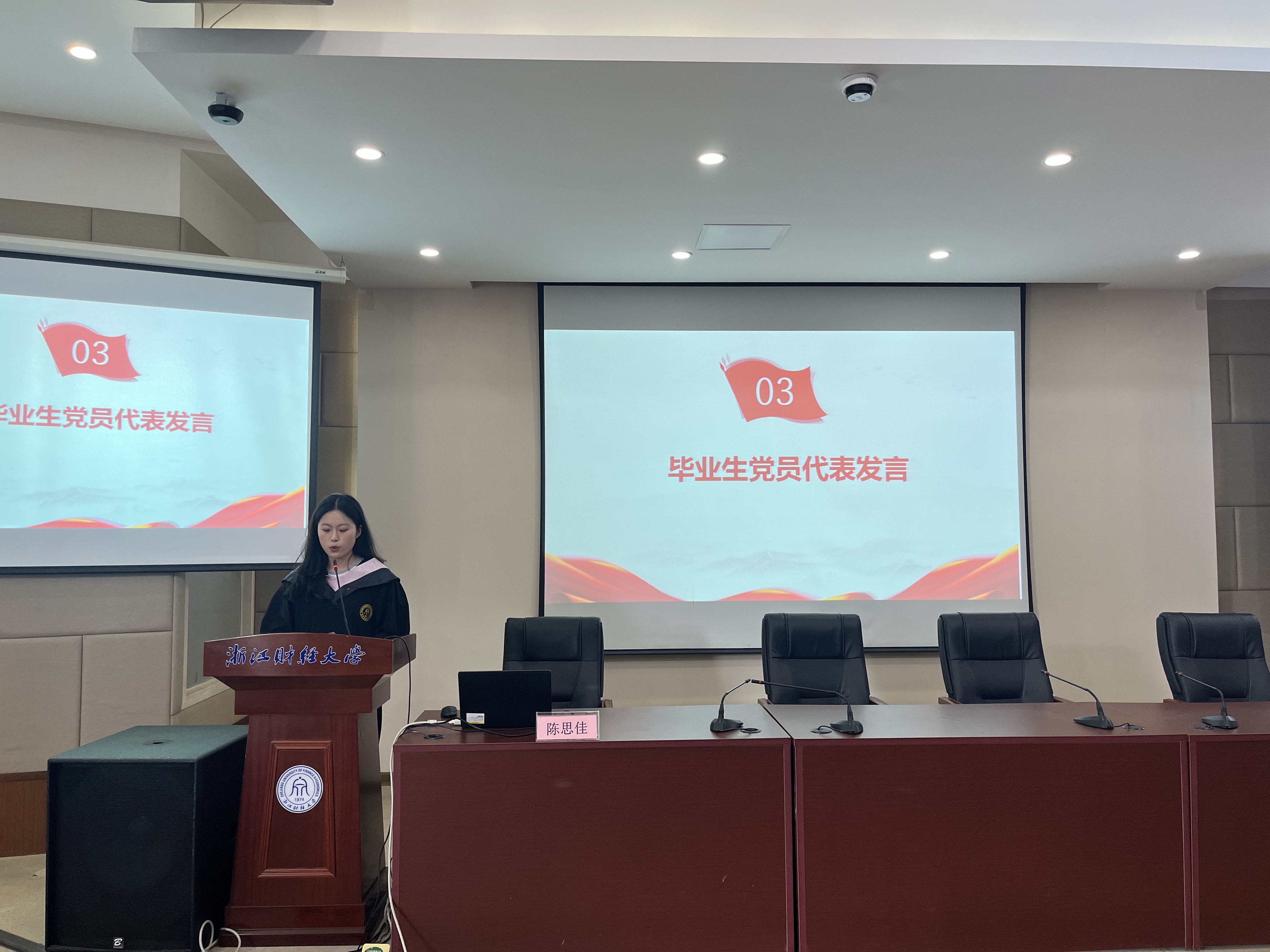 本科生第六党支部楼一凡同学代表全体毕业生党员发言,她结合自身参与党日活动、党课学习等经历,强调“必须时刻警醒,筑牢思想防线”并鼓励毕业生党员们带着母校的教诲和期望再出发,以廉洁为准则,以奋斗为姿态,在新征程上不忘初心,砥砺前行,为实现中华民族伟大复兴的中国梦贡献自己的青春力量!