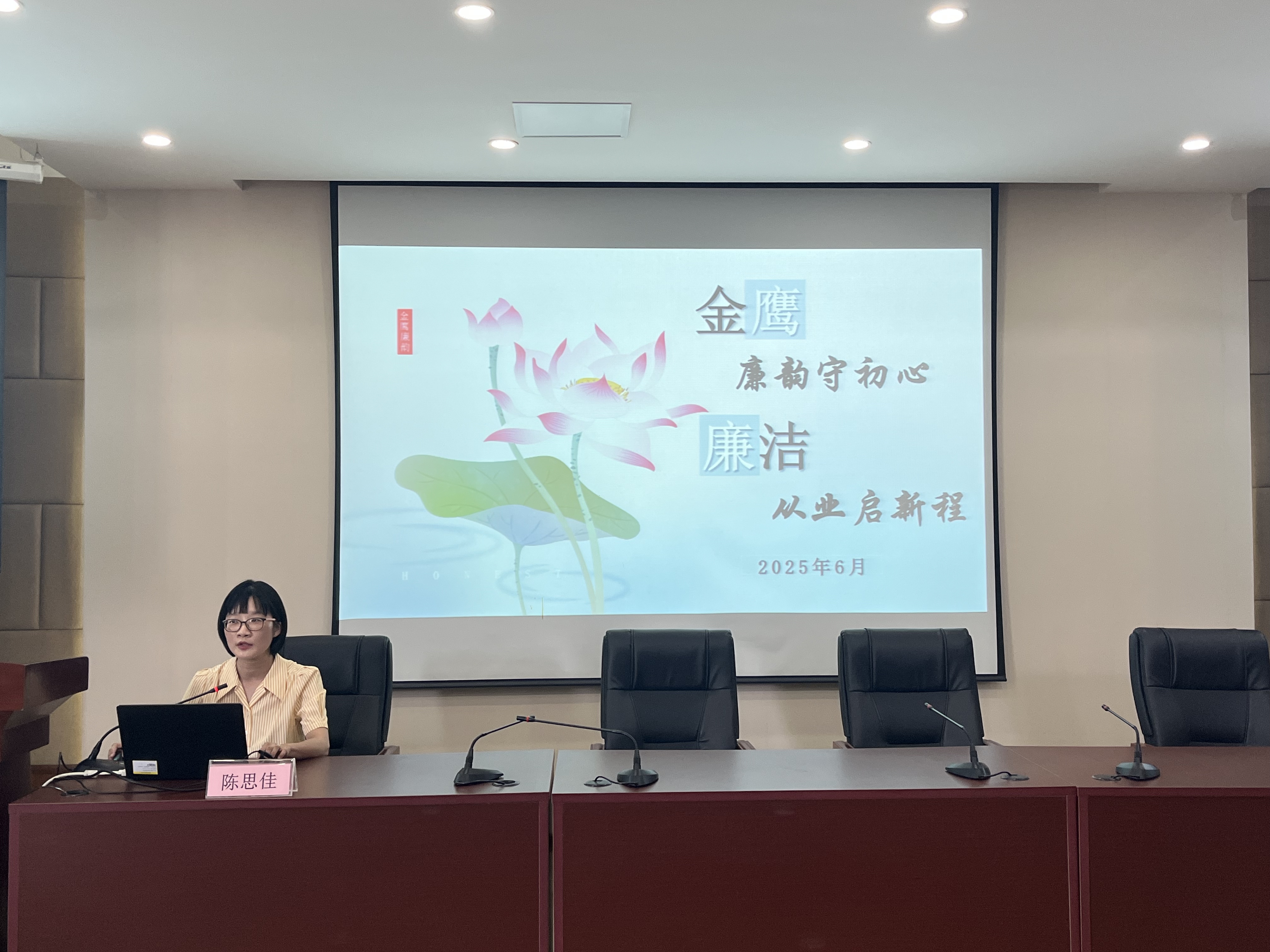 会议伊始,陈思佳书记为全体毕业生党员上了一堂题为《金鹰廉韵守初心廉洁从业启征程》的党课。陈书记结合深入贯彻中央八项规定精神学习教育,从《中国共产党章程(修正案)》中关于党的纪律的规定和《中国共产党纪律处分条例》出发,紧扣青年党员成长发展实际,深刻剖析了近年贪腐年轻化典型案例,警示大家要扣好廉洁自律的“第一粒扣子”。她从“廉洁·意”“廉洁·义”“廉洁·路”三个部分,深入讲解了廉洁从业的内涵与意义,勉励毕业生党员要将“廉动力”与“青动力”相结合,树廉洁之心、行廉洁之事、做廉洁之人,要始终保持党员的先进性和纯洁性,以廉洁自律的实际行动为党和人民的事业贡献力量。