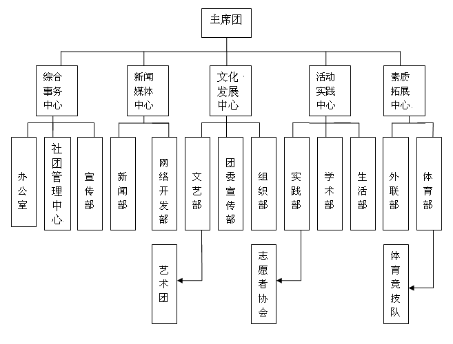 团委下设团委学生会,共有5大中心,13个部门,各部门各司其职,各个部门求实创新,举办有部门特色的各类活动,但同时学生会倡导“家文化”,强调整体凝聚力,各部门团结协作,共同促进学生会组织的良好发展。