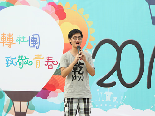 会长张倬男在体育馆前热情讲话,号召同学踊跃加入,幽默诙谐的言语引发阵阵欢呼,即将送出的神秘大礼更令人遐想无限,活动现场高潮迭起,招新情况愈加火爆。