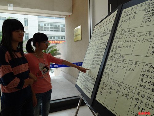 学生考证特色所设立的“考证服务专区”。该专区存放了大学四年所有考证所需的相关书籍和复习资料,为考证的同学提供了更好更周到的服务。专区更设有干事为新生讲解考证相关事宜并为他们挑选所需书本及资料。