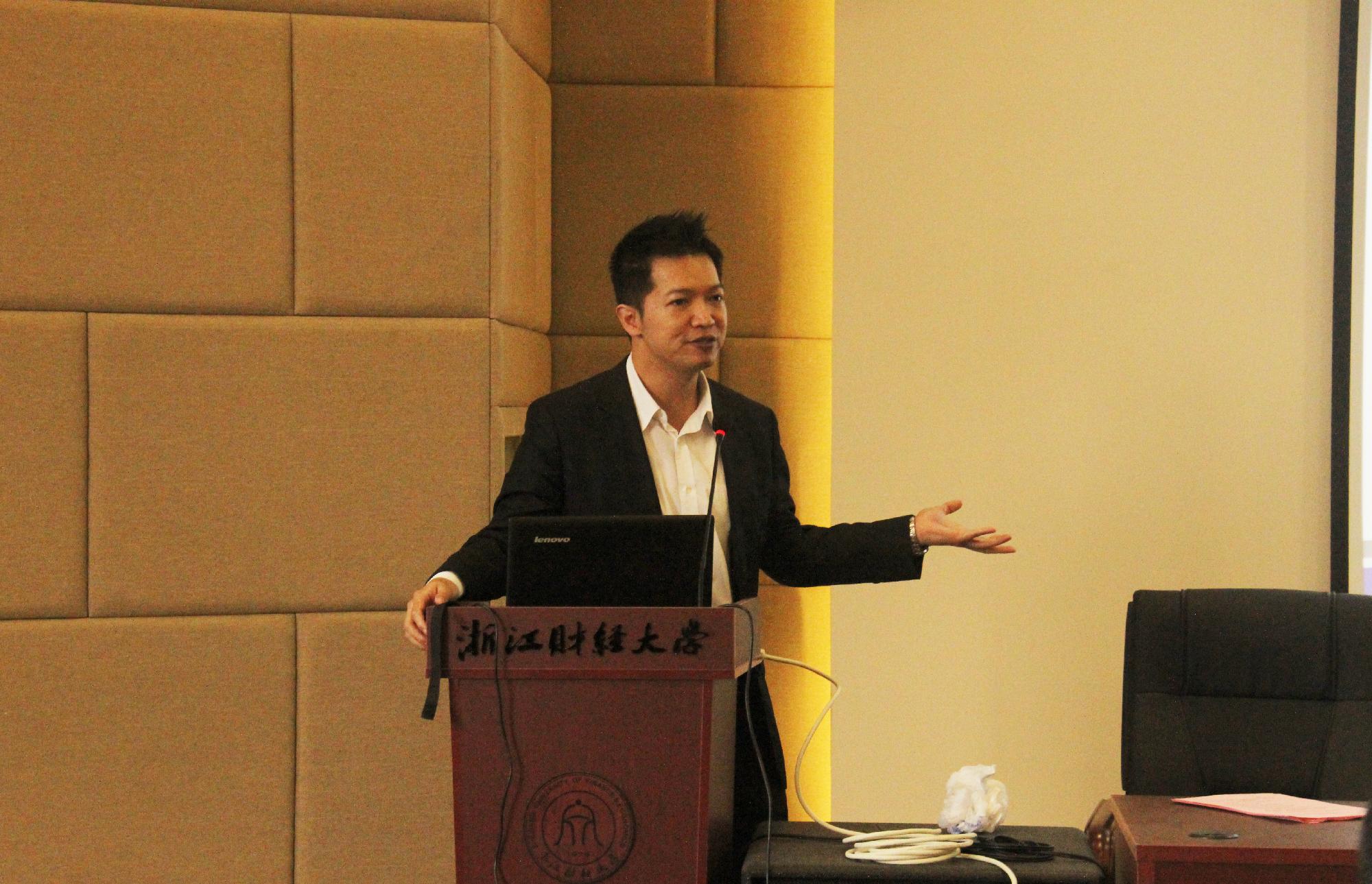 的同学们寄予了厚望,祝愿每一位参赛选手在竞赛中都有所收获,为校争光。阵阵掌声中,南华期货研究所产品创新分析师吴明星先生以专业的语言就金融期货品种及实物投资策略作了介绍,带领同学们在期货世界中感受它的无穷魅力。他先以选秀为例用图像来说明如何在单分与多分的偏好中寻求平衡;再生动地用人性为孤岛,只有通过市场才能相互联系的例子来介绍金融市场,用一段有趣的视频让我们对羊群效用印象深刻;随后,吴明星先生为了告诉大家投资需要智商和情商,判断数字就要对市场评估,与台下同学进行了简明有趣的互动与小游戏;最后,对金融期货大纲中的新增与热点内容(如ETF、非美货币等)做了一些阐释与提醒,使前来参加活动的同学获益匪浅。接着是谈效俊先生,他介绍了看涨(call)期权、看跌(put)期权、欧式期权、美式期权以及它们之间的联系与组合,从买入看涨期权的收益图讲起,逐渐深入,细致扼要,让同学们更加直观的了解买卖平价关系,并引入了隐含波动率的概念。除此之外,王敏男先生还详细介绍了衍生品知识与国际掉期和衍生品协会(ISDA),加强了同学们对场内与场外衍生品市场的区别以及场外衍生品的重要性的认识,又介绍了具有“固定+衍生”特性的结构化产品,指出中国的衍生品发展迅速且空间巨大,应对该产业的前景充满信心。在活动结束之时,陈荣达教授向南华期货研究所提出了需要拥有哪方面人才的问题时,“急需定价与行销企划方面的人才,并最好具备很强的电脑技术”让在场同学有了更明确的努力方向。