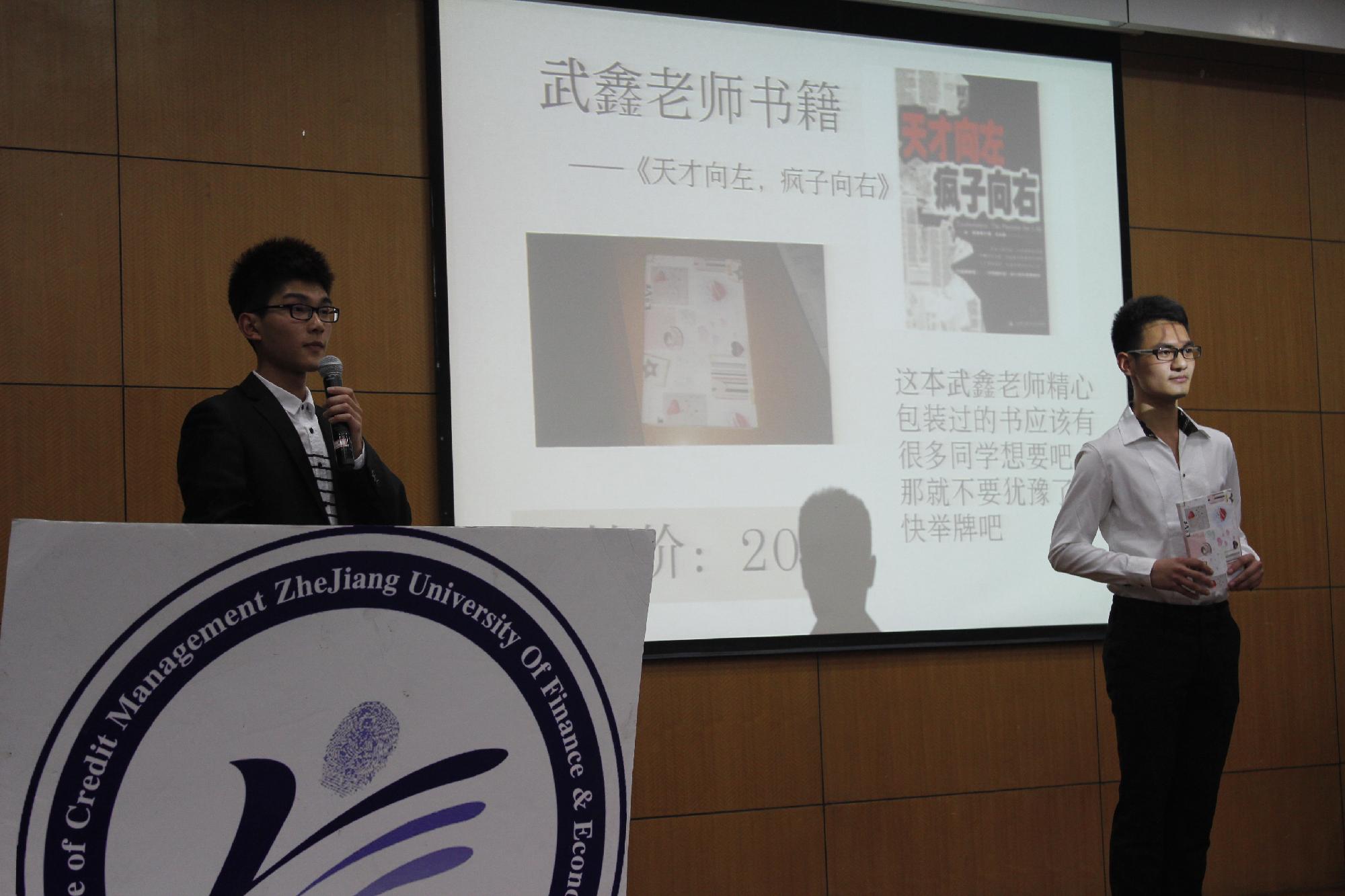 本次拍卖会还拿出几件神秘拍品。“金融第一帅”武鑫老师提供了一本自己亲手包装的书籍——《天才在左,疯子在右》。这件拍品激起了学子们极大的兴趣,大家都希望能拍下书籍表示对拍卖会以及武鑫老师的支持。现场的学生们一听完介绍,纷纷毫不犹豫地举牌,最终书籍以两倍于起步价的价格成交。为了助力大家的学业,信管学会还特意准备了“学霸套餐”。拍下本套餐的同学可以享受一名学霸的数学辅导,内容可选择微积分、线性代数和概率论。在激烈的争拍中,好学的97号竞拍者以高价拍得该套餐。这样的惊喜似乎还不够,“院花”毛琼的一组私密照也赫然出现在拍品之中。为了不让院花即前任会长照片外流,金融学会现会长张倬男参与了激烈的竞拍,最终却不敌现场毛琼的男粉丝。之后毛琼对拍品做了一段描述,并和拍下私密照的男粉丝亲密合影留念。
