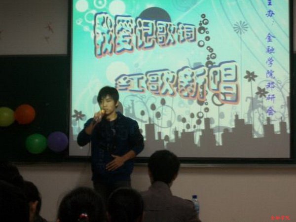 最后一个环节“红歌争霸赛”,金融1班的毛琼、陈文俊同学凭着《我的中国心》和《中国人》分别获得了最佳台风奖和“歌词大人”的称号。