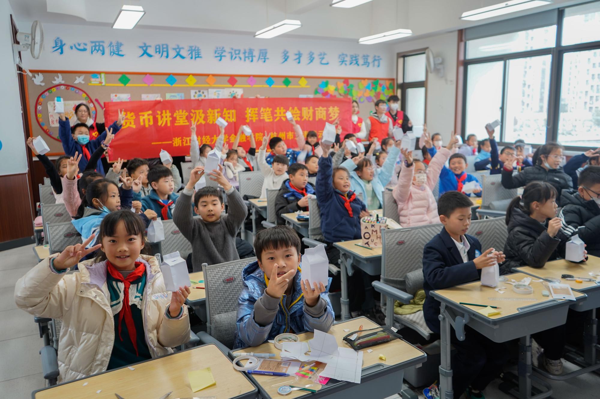 青年志愿者走进杭州市文海凌云小学,为403班和305班的小朋友开展“货币讲堂汲新知,挥笔共绘财商梦”主题志愿服务活动,帮助孩子学习货币知识,培养财商观念。