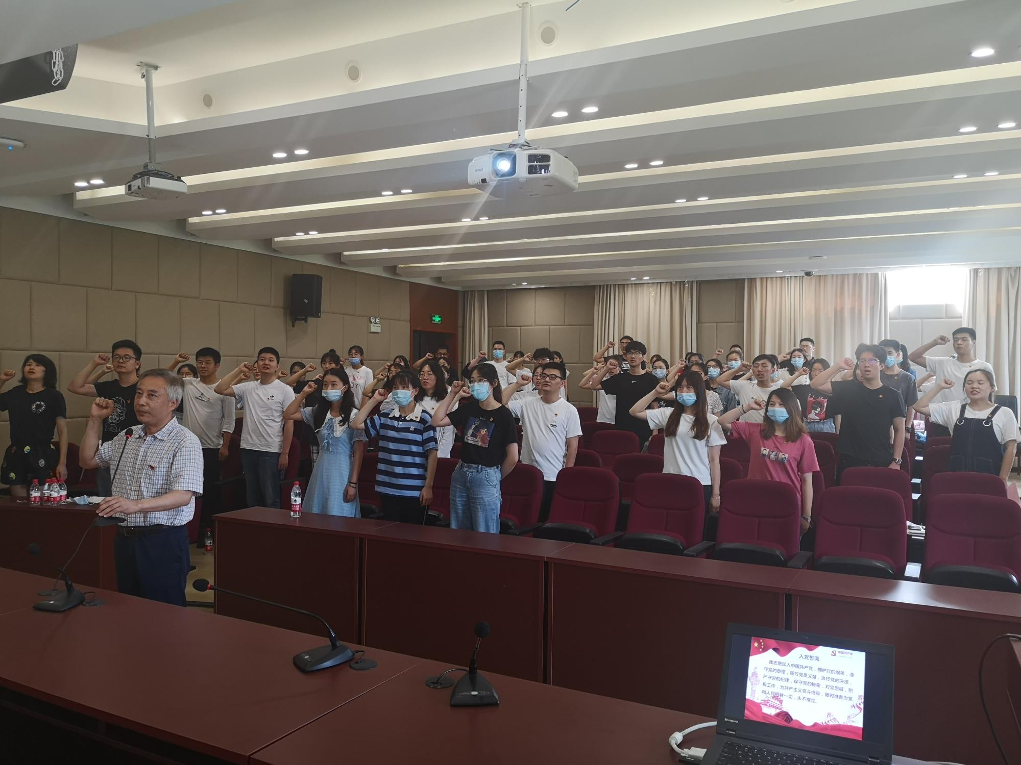 宣誓仪式上,各位老党员给新党员们佩戴党徽、赠送政治生日贺卡。而后,全体新党员在蔡书记的领誓下,举起右手,昂首挺胸,面向党旗庄严宣誓,表达对党忠诚和愿意为共产主义事业奋斗终生的决心。本科生第二党支部丁洁婷同志代表新党员发言,表达了不忘初心跟党走、争做优秀共产党员的坚定信念。