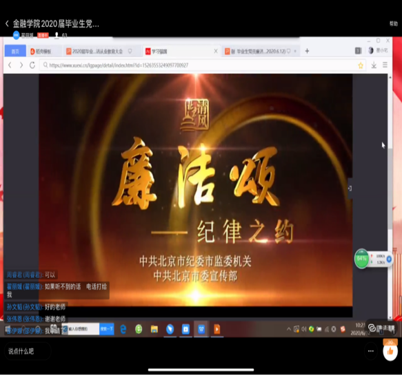 为进一步加强毕业生党员教育管理,提高毕业生党员的思想觉悟、党员意识、党性修养和社会责任感6月12日上午,酷爱成人网 党委召开2020届毕业生党员廉洁从业教育线上会议,学院党委副书记兼纪委书记谢敏、专职组织员翟丽媛、各学生党支部书记和2020届全体毕业生党员参加了大会。会议由翟丽媛主持。