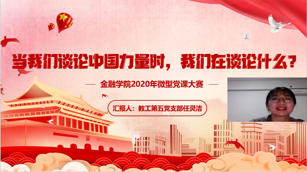 教工第五党支部任灵洁老师从新冠肺炎疫情彰显中国力量的角度,分享了国之大士李兰娟院士、普通党员郑世茂的感人事迹,告诉我们因为这些无数温柔又英勇,平凡又不平凡的中国力量挺起了中国脊梁。