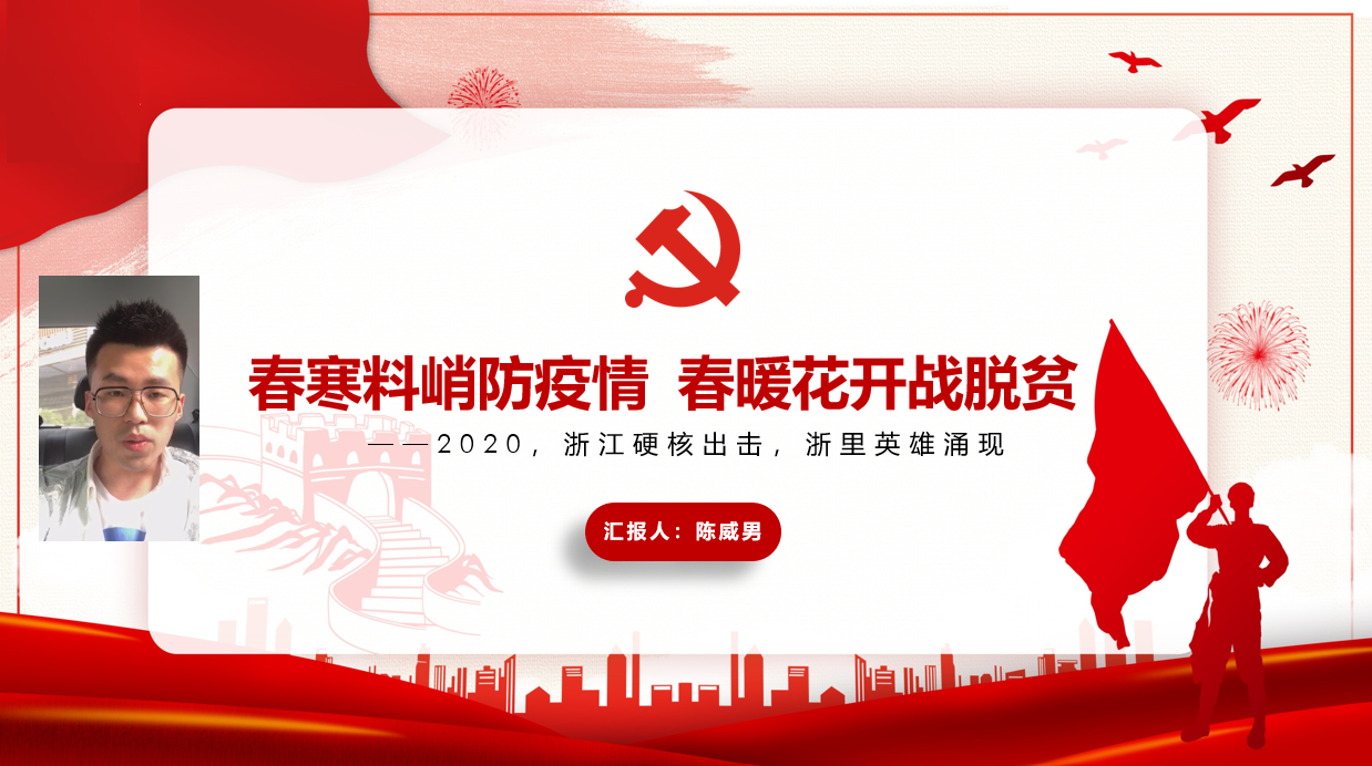 本科生第二党支部陈威男同学以“春寒料峭防疫情,春暖花开战脱贫”为主题,从浙江、学校、个人所在支部三个层面,讨论了抗疫脱贫之路,学习其内涵精神。