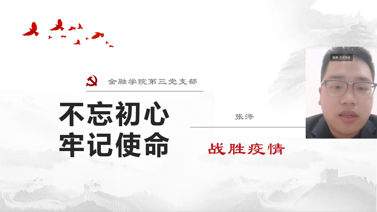 研究生第四党支部周伊琳同学阐述了今年这场突发的疫情来得让人措手不及,对于我们国家来讲,是灾难、是挑战;是对党的执政能力、国家治理能力的全面考验,也是对我们每个人的道德素养、初心使命的一次大考。